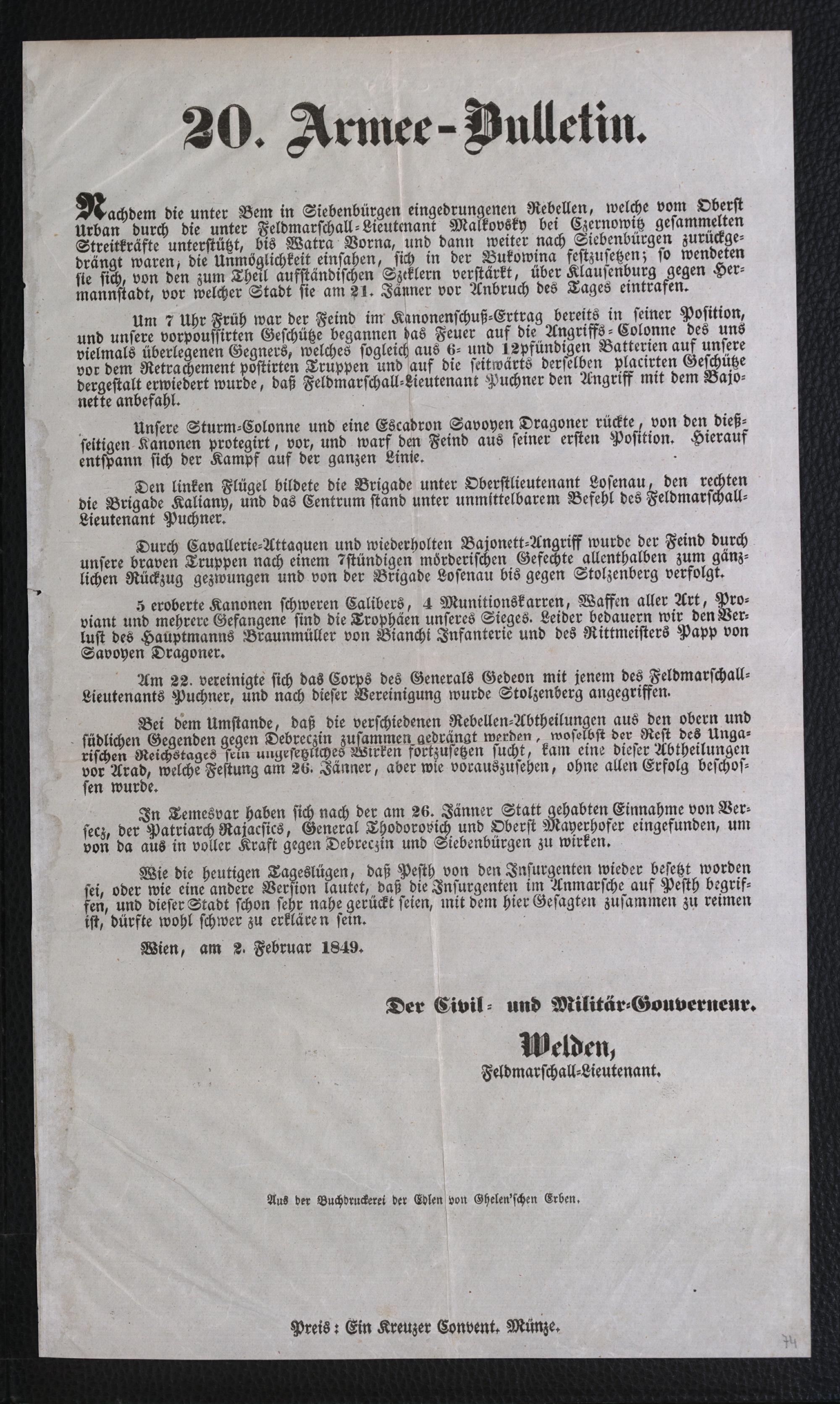 20. Armee-Bulletin : Wien, am 2. Februar 1849 / Der Civil- und Militär-Gouverneur. Welden, Feldmarschall-Lieutenant
