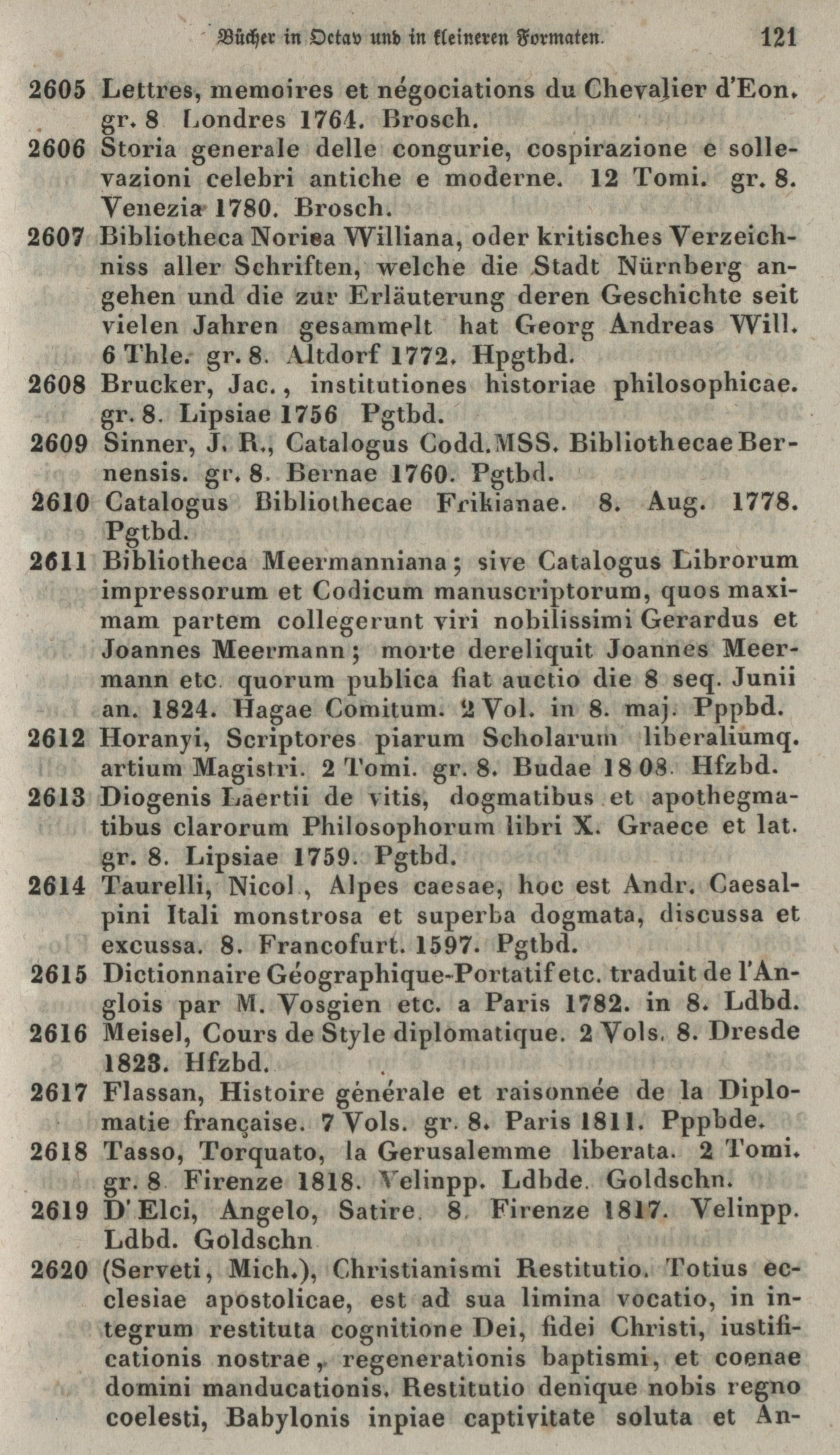 Verzeichniss der hinterlassenen werthvollen Bibliothek weiland des Herrn Herrn Abbé Joh. Baptist Ritter von Bearzi, päpstlichen Protonotars und Geschäftsträgers Sr. Majestät des Königs beider Sicilien am k. k. Wiener Hofe etc. etc. : welche den ... 1854 und die darauf folgenden Tage in Wien, Nachmittags von 3 - 7 Uhr, unter der Leitung des beeideten k. k. Bücherschätzmeisters und Verfassers dieses Cataloges, Jakob Bader, öffentlich gegen baare Zahlung versteigert werden