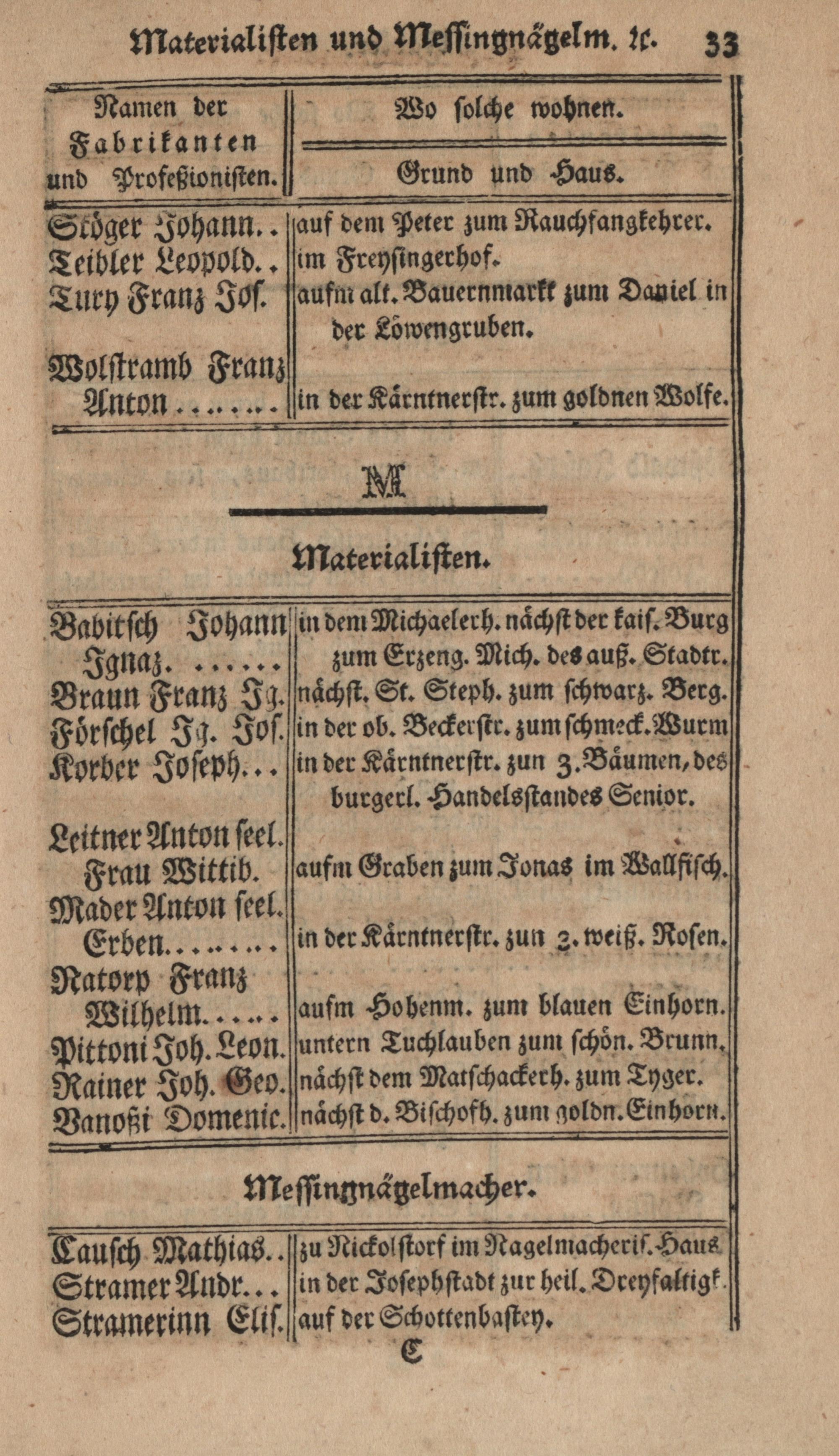 Oesterreichisches Mercantill-Schema, oder Verzeichniß aller Künstler, Manufakturisten, Fabrikanten, und Profeßionisten, so hauptsächlich in das Mercantille oder auf dem Kauf arbeiten, wie auch mit Anzeigung deren Tauf- und Zunamen, Ort, Grund, Gassen, Haus und Schilder, wie solche mit Anfang des 1766. Jahres befindlich waren : nebst allen allhier in Wien befindlichen Niederlaagsverwandten, sammt Kauf- und Handelsleuten