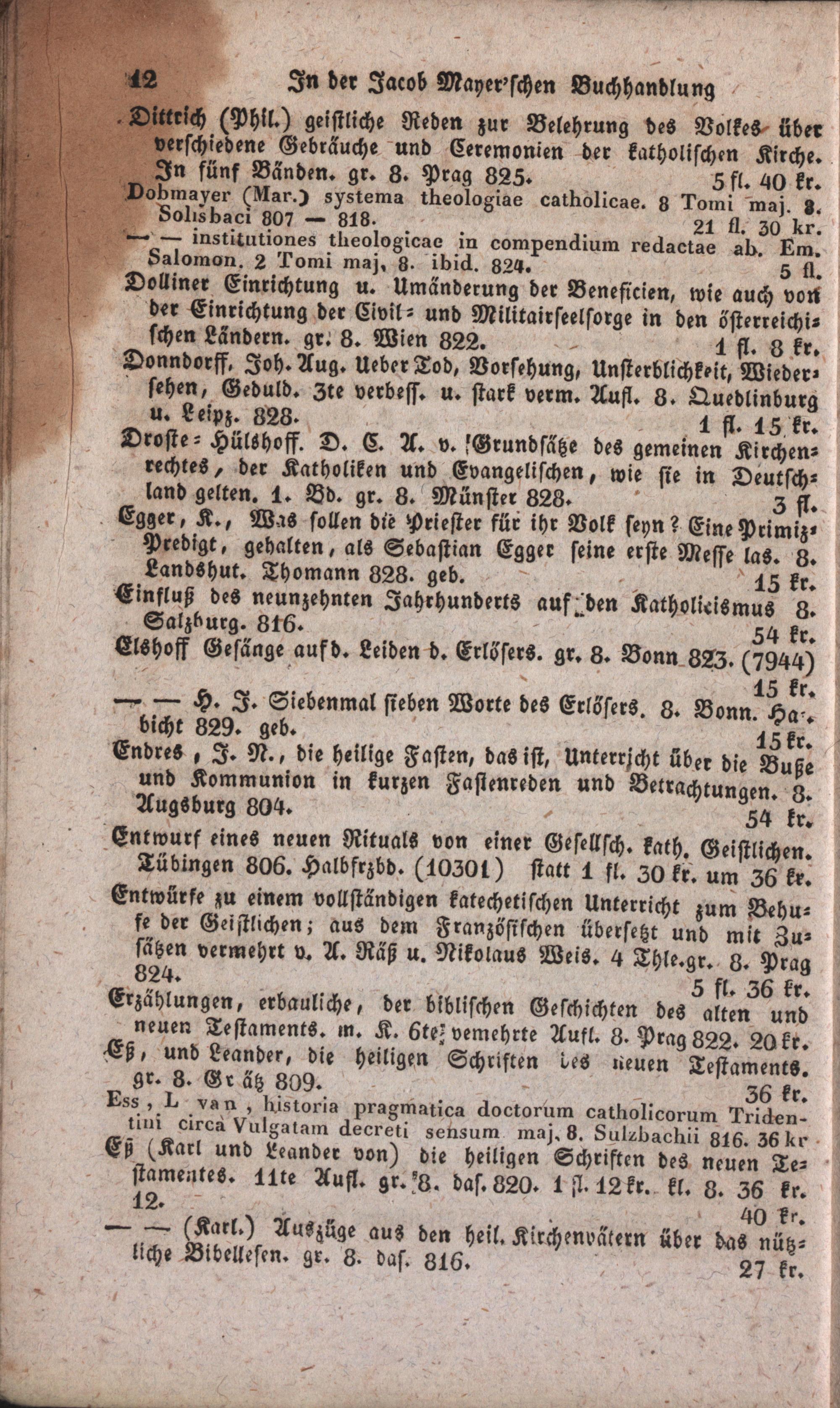 Verzeichniß theologischer Schriften älterer und neuerer Zeit bis zum Schlusse des Jahres 1829 : worunter mehrere um bedeutend herabgesetzte Preise Nebst einem Anhange von Gebeth- und Erbauungsschriften, welche in der Jacob Mayer'schen Buchhandlung (in Wien, Singerstraße, deutsches Haus an der Ecke) zu haben sind