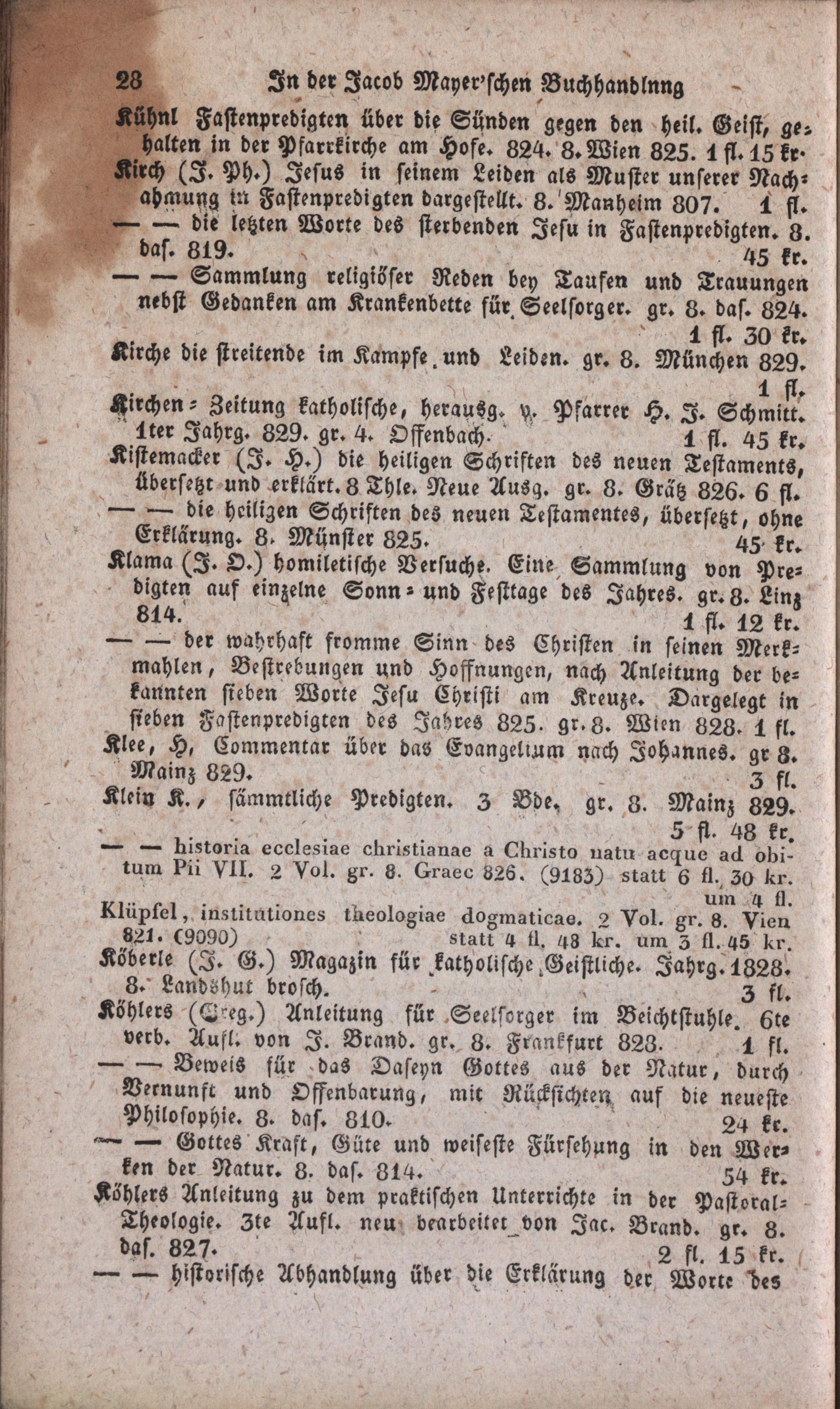Verzeichniß theologischer Schriften älterer und neuerer Zeit bis zum Schlusse des Jahres 1829 : worunter mehrere um bedeutend herabgesetzte Preise Nebst einem Anhange von Gebeth- und Erbauungsschriften, welche in der Jacob Mayer'schen Buchhandlung (in Wien, Singerstraße, deutsches Haus an der Ecke) zu haben sind