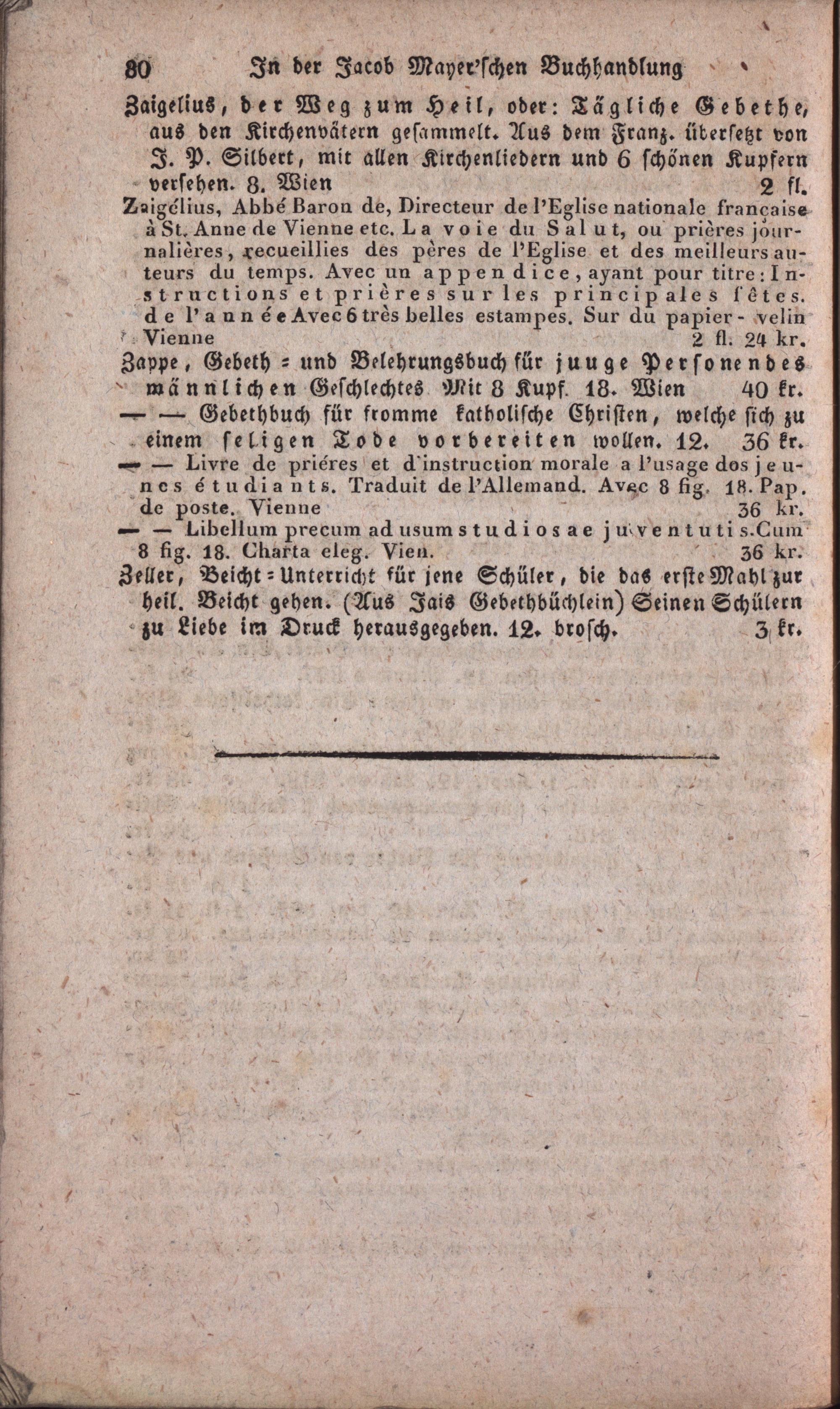 Verzeichniß theologischer Schriften älterer und neuerer Zeit bis zum Schlusse des Jahres 1829 : worunter mehrere um bedeutend herabgesetzte Preise Nebst einem Anhange von Gebeth- und Erbauungsschriften, welche in der Jacob Mayer'schen Buchhandlung (in Wien, Singerstraße, deutsches Haus an der Ecke) zu haben sind