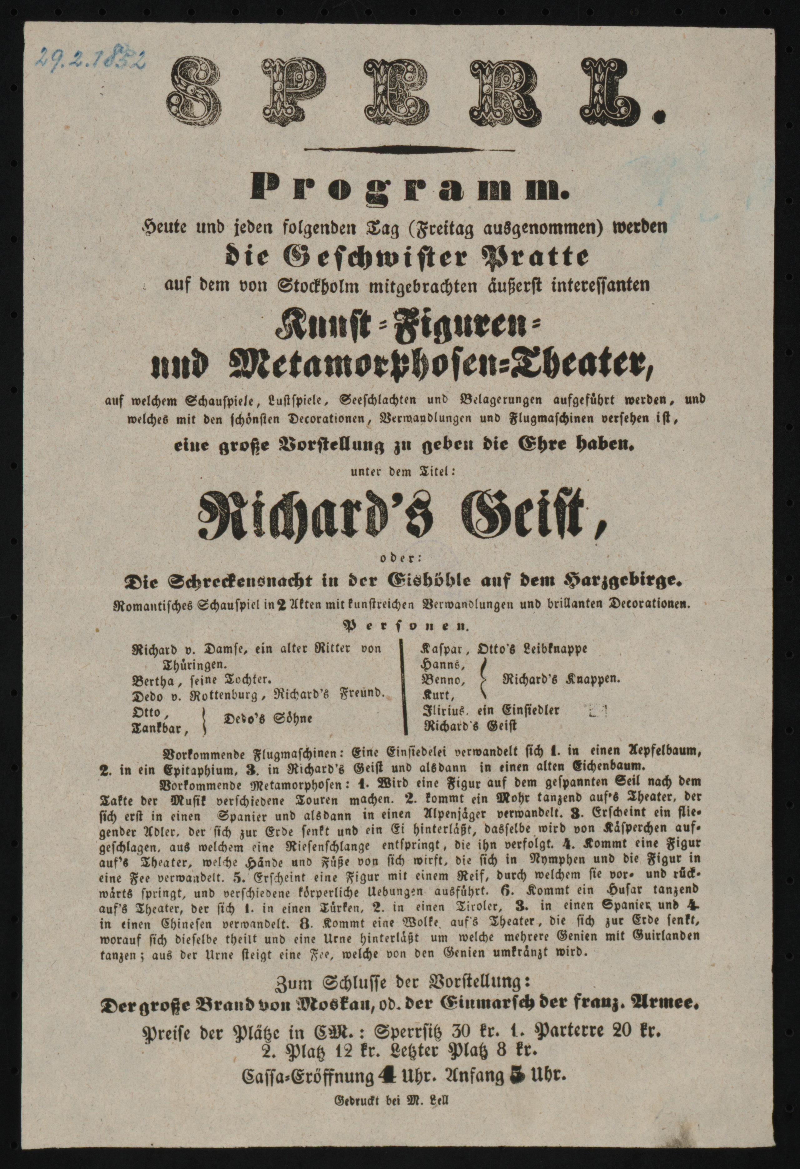 Sperl. Programm. Heute und jeden folgenden Tag (Freitag ausgenommen) werden die Geschwister Pratte auf dem von Stockholm mitgebrachten äußerst interessanten Kunst-Figuren- und Metamorphosen-Theater, auf welchem Schauspiele, Lustspiele, Seeschlachten und Belagerungen aufgeführt werden, und welches mit den schönsten Decorationen, Verwandlungen und Flugmaschinen versehen ist, eine große Vorstellung zu geben die Ehre haben, unter dem Titel: Richard's Geist, oder: Die Schreckensnacht in der Eishöhle auf dem Harzgebirge : Zum Schlusse der Vorstellung: Der große Brand von Moskau, od. der Einmarsch der franz. Armee