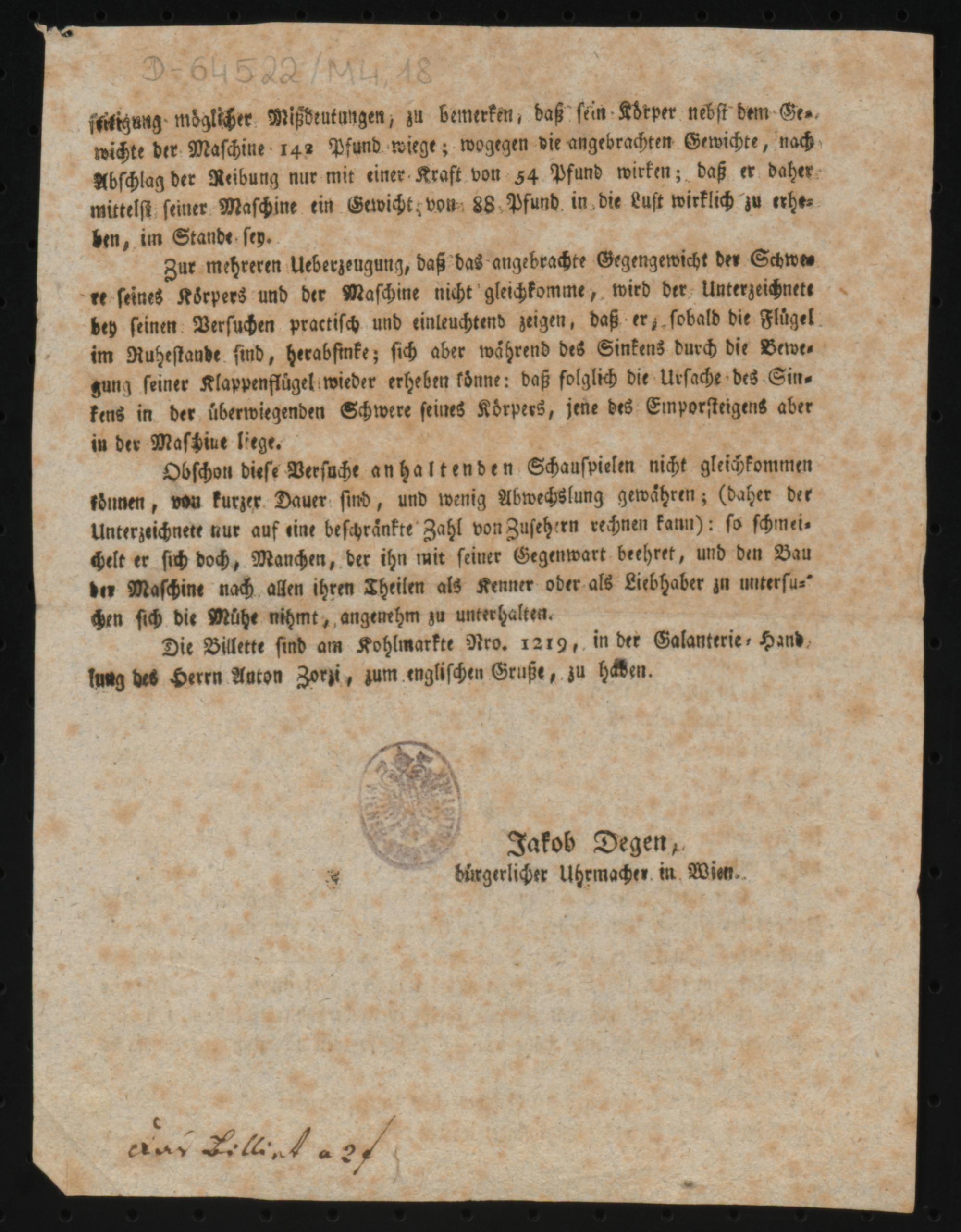 Neu erfundene Flugmaschine : Die in die Augen fallenden Vortheile, welche die wohlthätige Natur den beflügelten Geschöpfen in dem Vermögen sich über die Oberfläche der Erde frey zu erheben, und schwebend nach jeder Richtung zu bewegen, zugewendet hat; erweckten in dem Unterzeichneten, wie in Mehreren vor und neben ihm, den Gedanken: ob es dem Menschen nicht möglich sey, die ihm mangelnde Fähigkeit zu fliegen, durch die Kunst zu ersetzen? ... gelang es dem Unterzeichneten, mit einem beträchtlichen Kostenaufwande eine Maschine zu erbauen, welche die Möglichkeit, sich mittelst künstlicher Flügel in die Luft zu schwingen, anschaulich zu machen, geeignet ist ... Mit allerhöchster Bewilligung ... wird der Unterzeichnete die von ihm erfundene und verfertigte Flugmaschine, in dem großen Saale des Universitätsgebäudes an der Hauptstiege im ersten Stocke, am Donnerstage den 17. September um 12 Uhr zu Ansicht aufstellen ... / Jakob Degen, bürgerlicher Uhrmacher in Wien