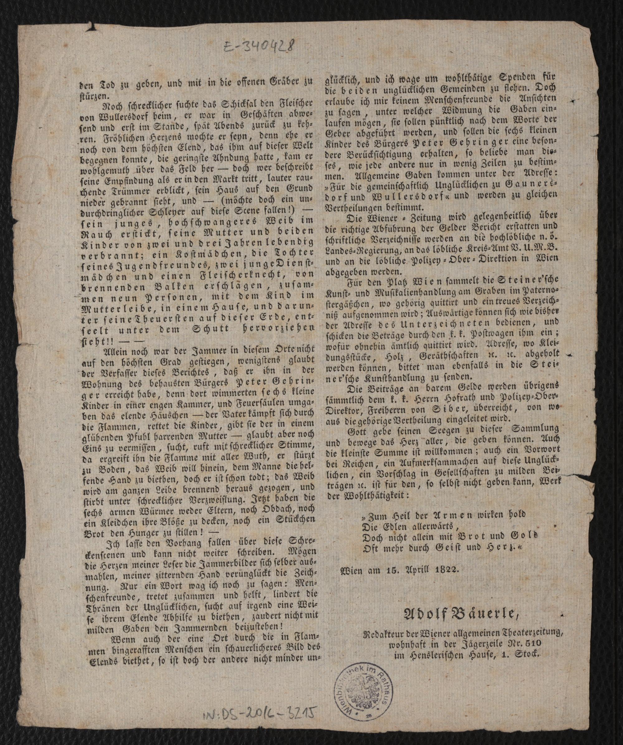 Jammer- und Schrecken-Scenen durch Feuer, in Nieder-Oesterreich V.U.M.B. : (Am 1. Aprill 1822 Mittags um 12 Uhr.) / Adolf Bäuerle, Redakteur der Wiener allgemeinen Theaterzeitung ...