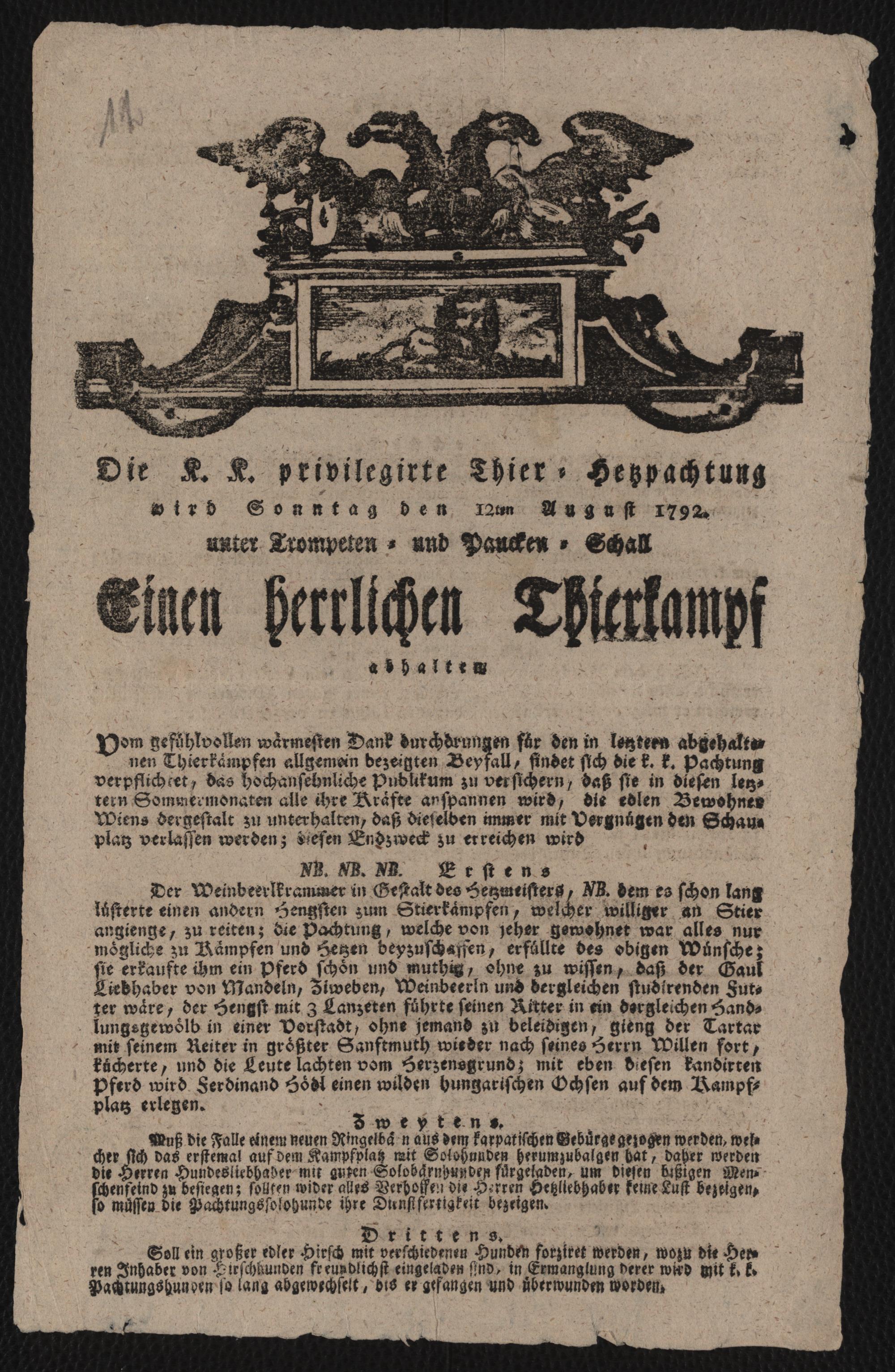 Die K. K. privilegirte Thier- Hetzpachtung wird Sonntag den 12ten August 1792. unter Trompeten- und Paucken- Schall Einen Herrlichen Thierkampf abhalten : Der Anfang ist mit dem Schlag 5 Uhr
