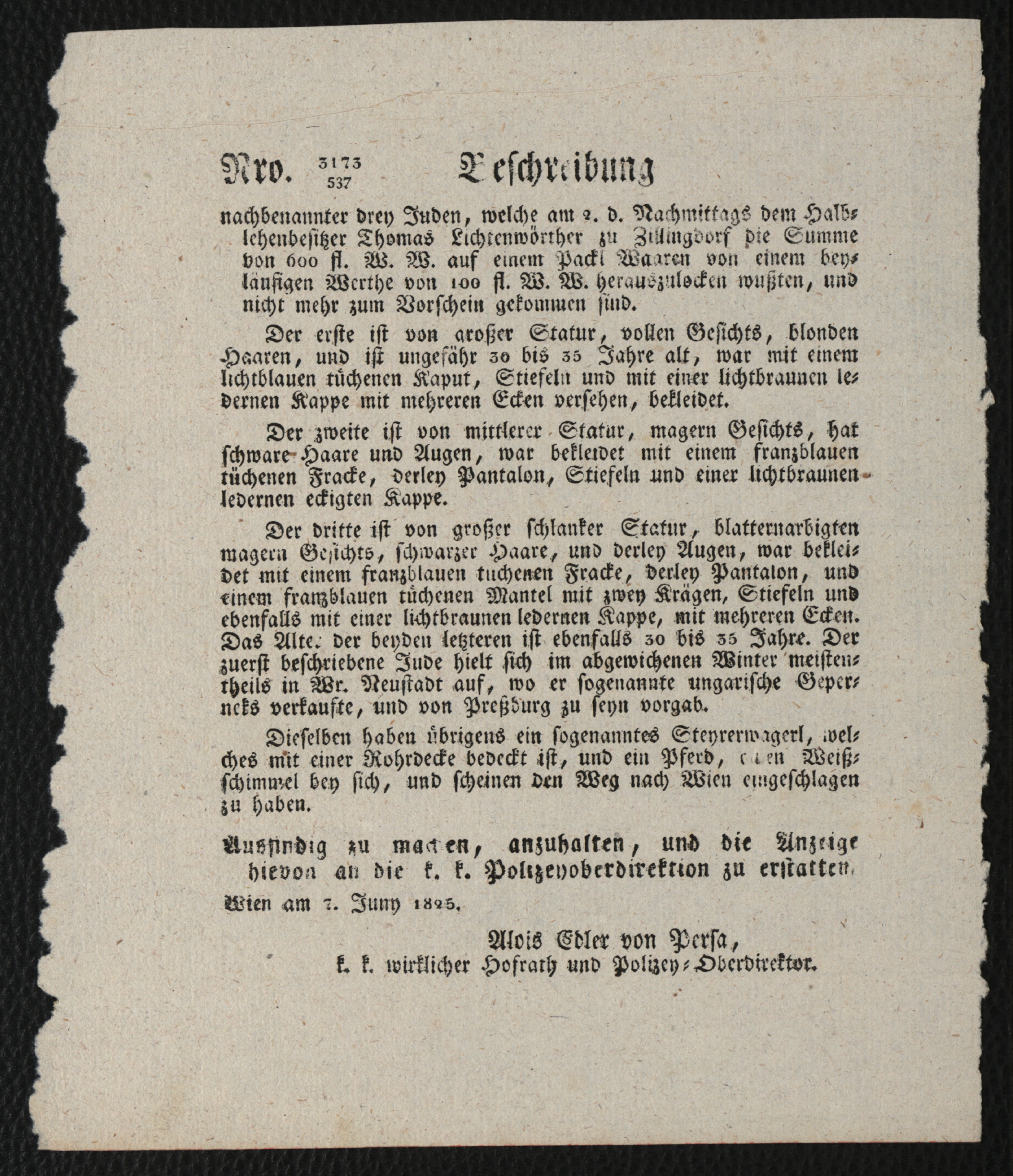 Beschreibung nachbenannter drey Juden, welche am 2. d. Nachmittags dem Halblehenbesitzer Thomas Lichtenwörther zu Zillingdorf die Summe von 600 fl. W. W. auf einem Packl Waaren von einem beyläufigen Werthe von 100 fl. W. W. herauszulocken wußten, und nicht mehr zum Vorschein gekommen sind : Wien am 7. Juny 1825 / Alois Edler von Persa, k. k. wirklicher Hofrath und Polizey-Direktor