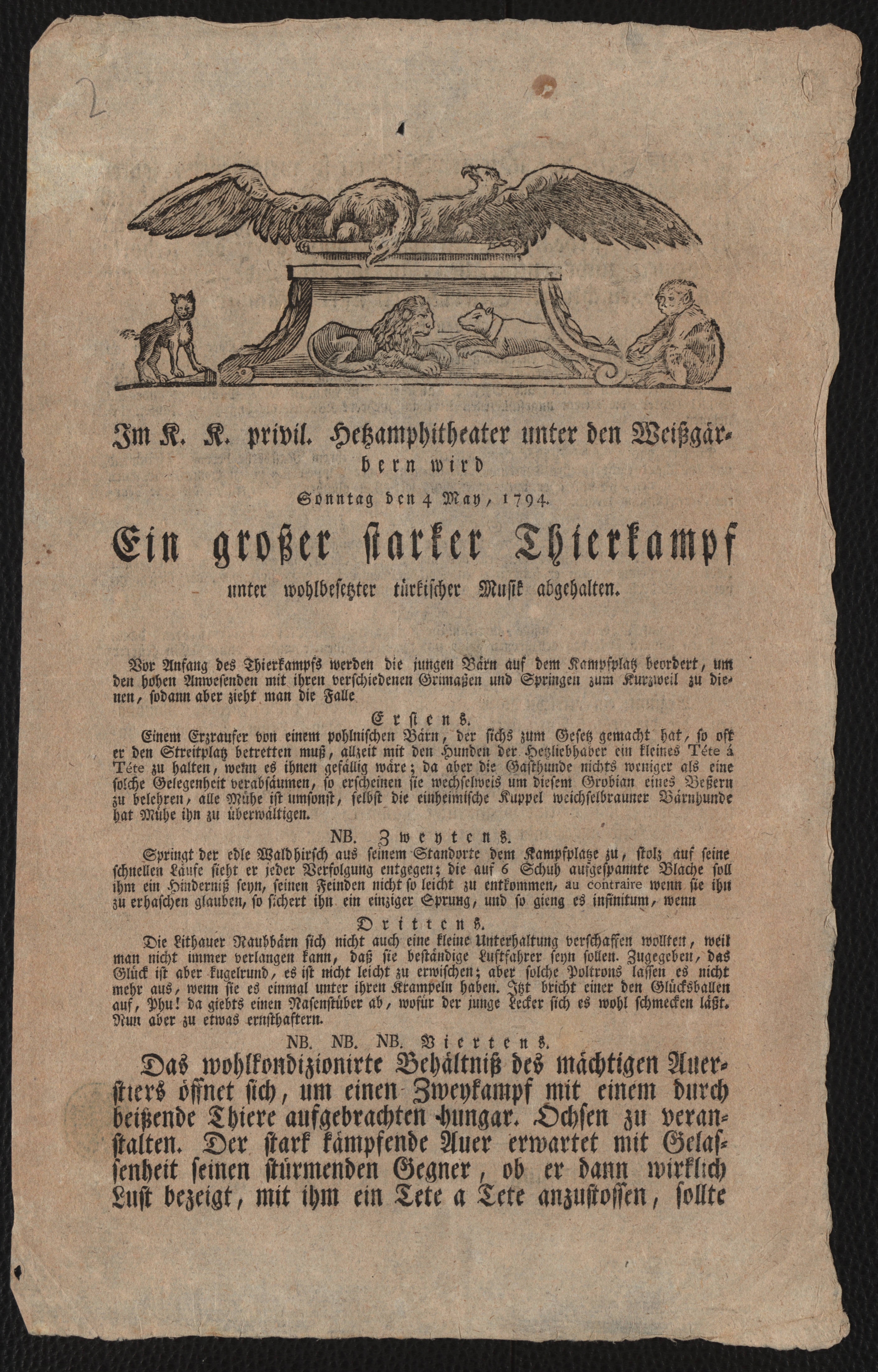 Im K. K. privil. Hetzamphitheater unter den Weißgärbern wird Sonntag den 4 May, 1794. Ein großer starker Thierkampf unter wohlbesetzter türkischer Musik abgehalten : Der Anfang ist mit dem Schlag 5 Uhr