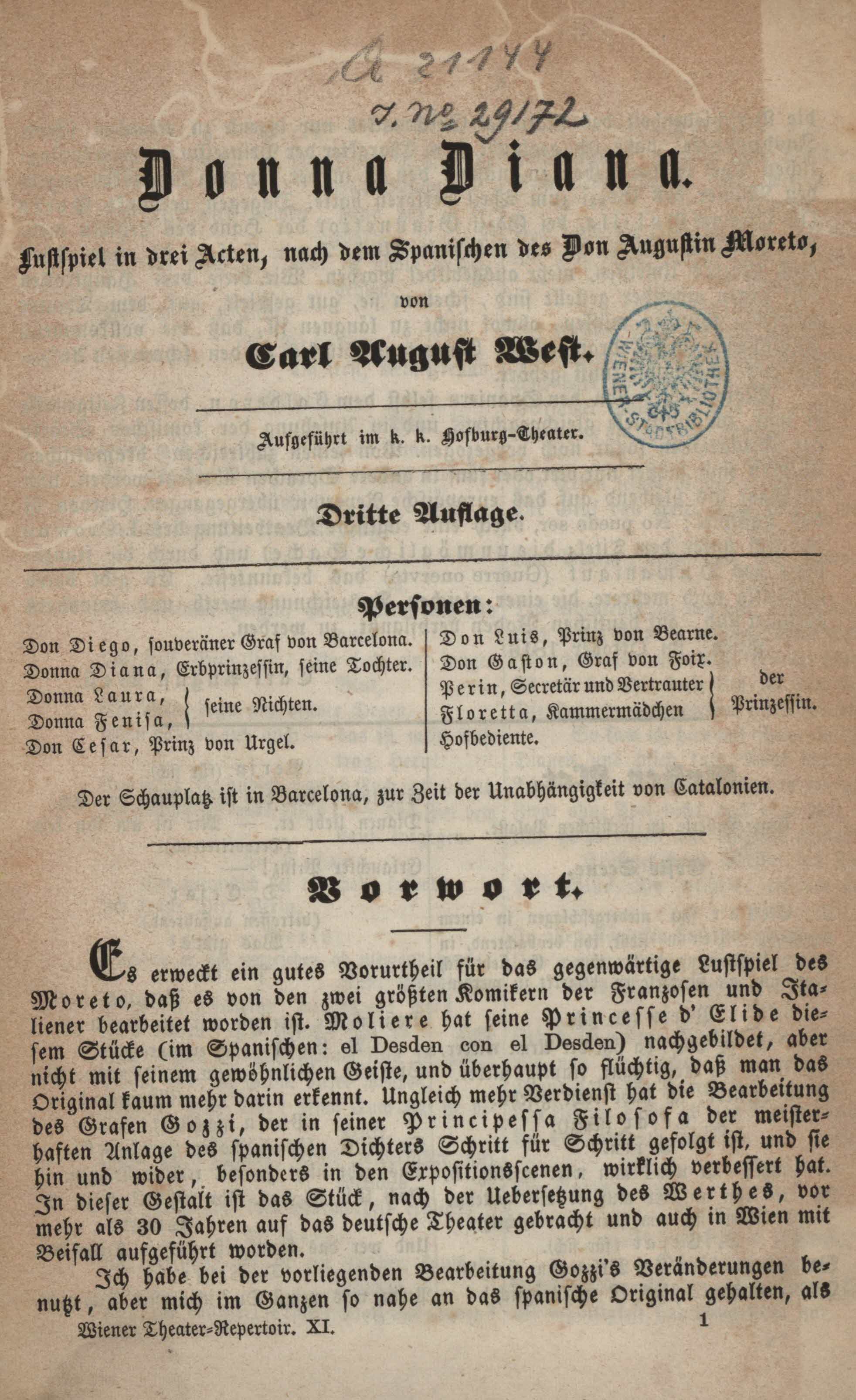 Donna Diana : Lustspiel in drei Acten / Nach dem Spanischen des Don Augustin Moreto, von Carl August West