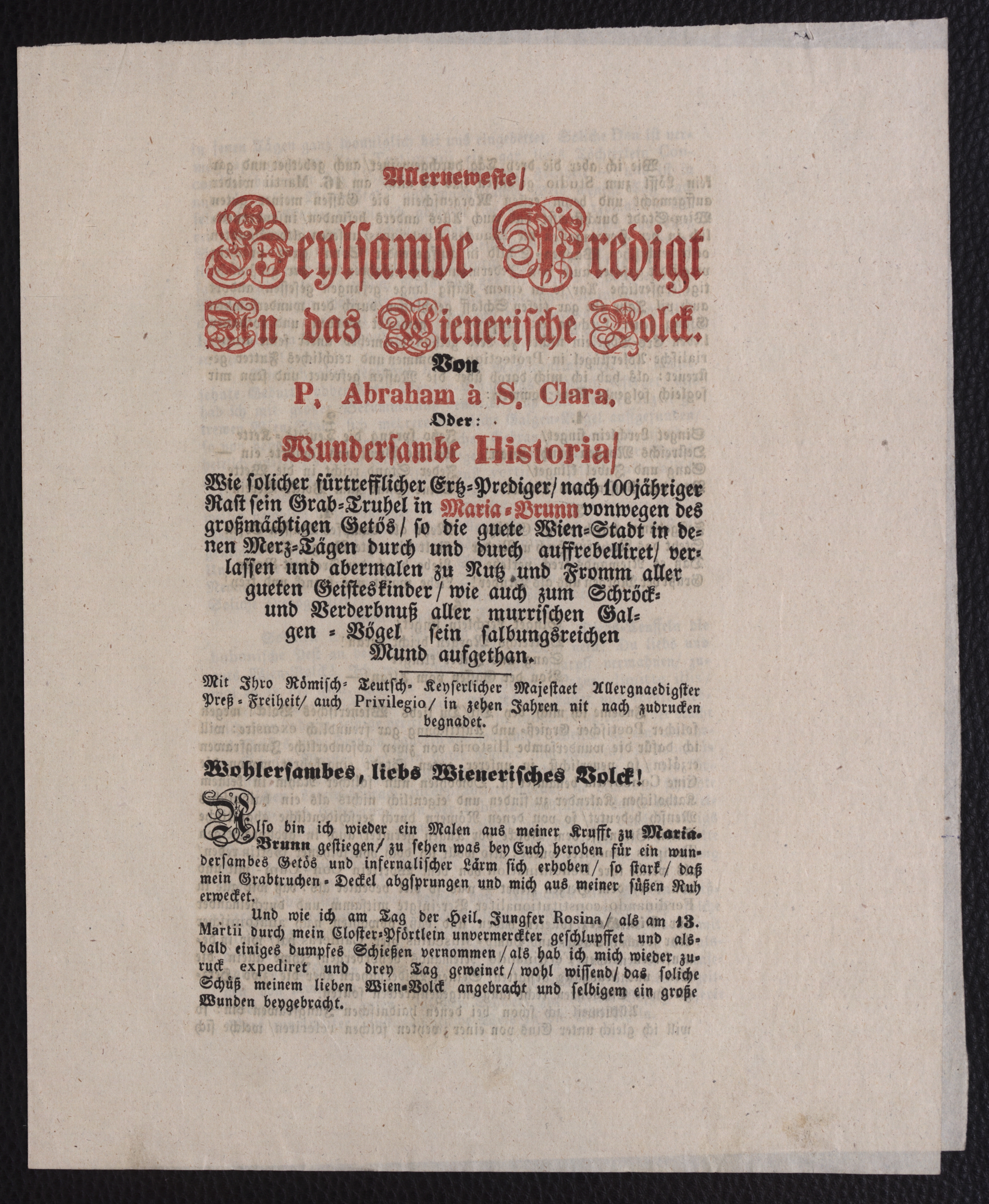Allerneweste, Heylsambe Predigt An das Wienerische Volck. Von P. Abraham à S. Clara, oder: Wundersambe Historia ... : [So geschrieben am 10. Aprilis im Jahre des Heyls im Ein Tausend Achthunder Viezigsten und Achten] / [durch Hilarium de Fonte acidulo / Einer freyen Reichs- und Keyserlichen Residentz-Stadt Wien freyem Insassen und Einer wohlehrsamben Volcks-Wacht schlecht armirtem Commembrum]
