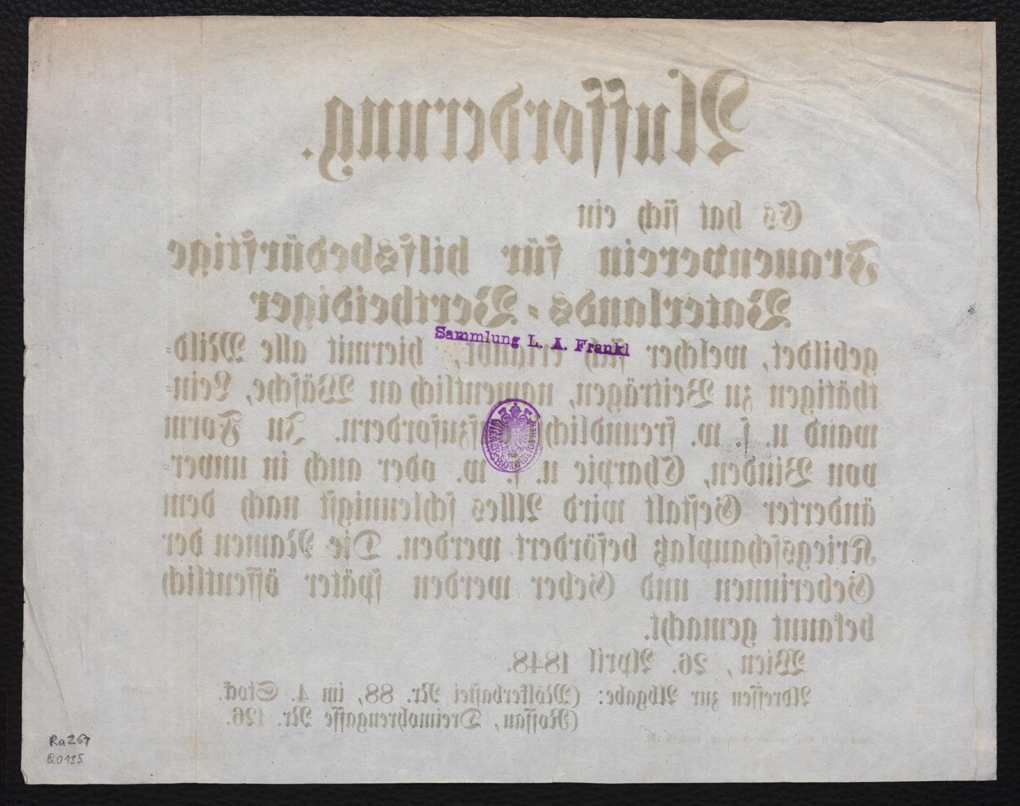 Aufforderung [Wien, 26. April 1848] : Es hat sich ein Frauenverein für hilfsbedürftige Vaterlands-Vertheidiger gebildet, welcher sich erlaubt, hiermit alle ...