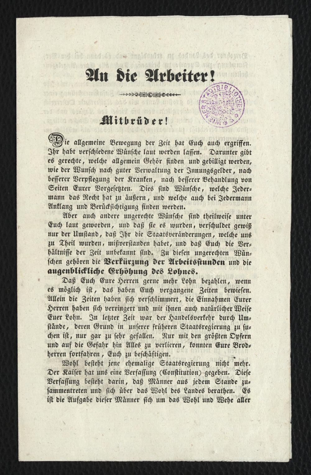 An die Arbeiter! : Mitbrüder! die allgemeine Bewegung der Zeit hat Euch auch ergriffen / [vom Arbeiterfreunde]