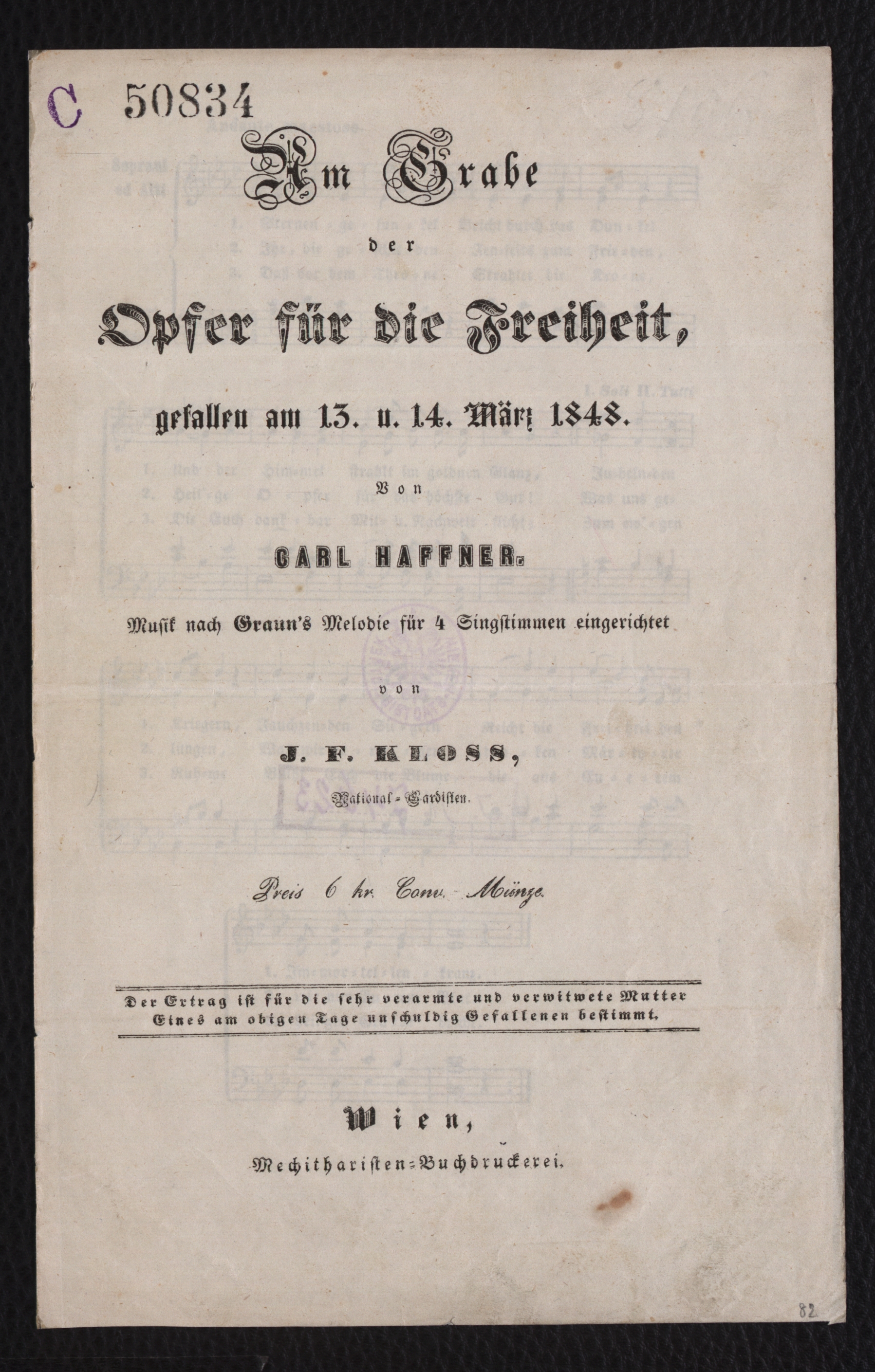 Am Grabe der Opfer für die Freiheit, gefallen am 13. u. 14. März 1848 / Von Carl Haffner. Musik nach Graun's Melodie für 4 Singstimmen eingerichtet von J. F. Kloss, National-Gardisten