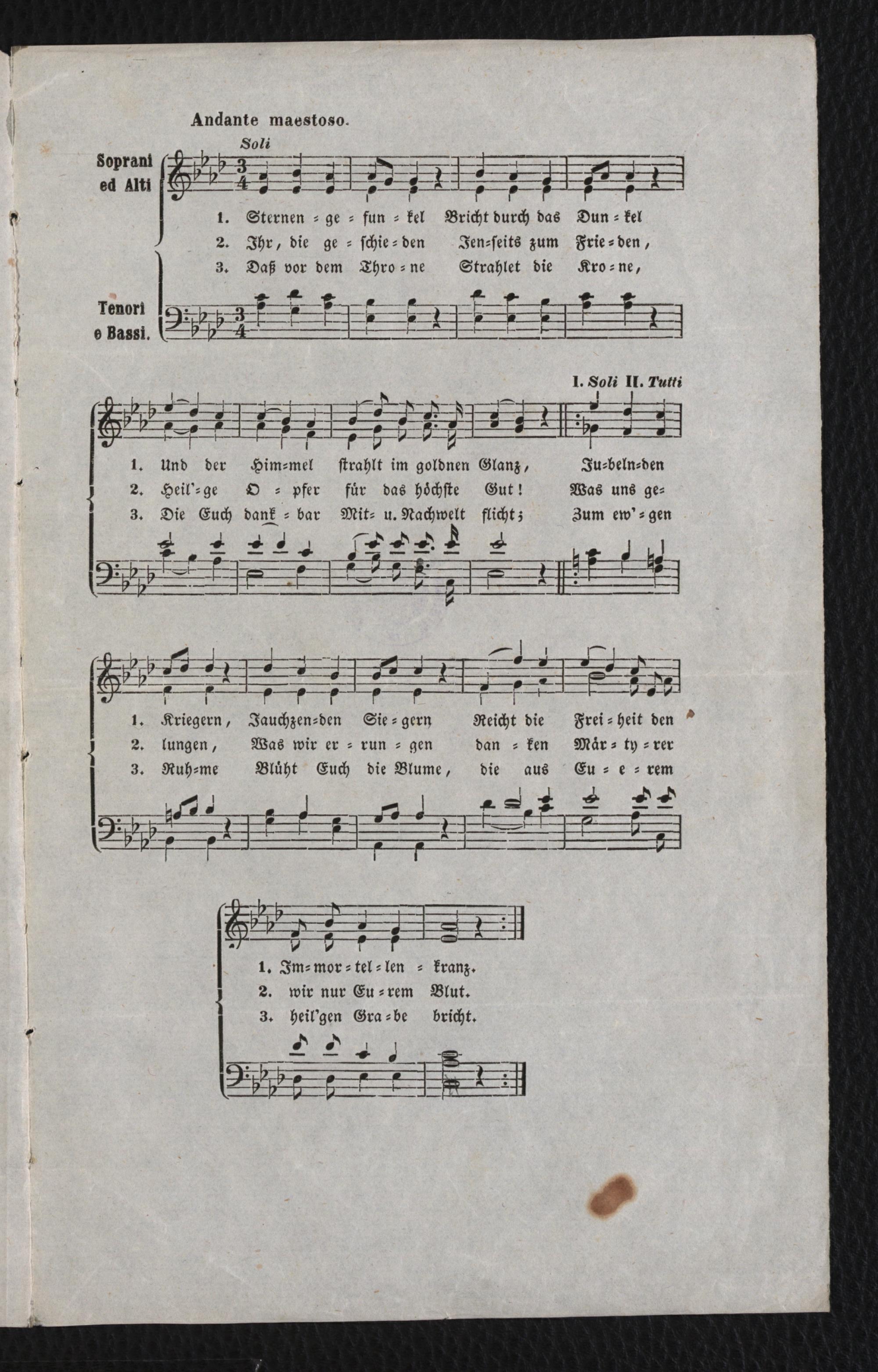 Am Grabe der Opfer für die Freiheit, gefallen am 13. u. 14. März 1848 / Von Carl Haffner. Musik nach Graun's Melodie für 4 Singstimmen eingerichtet von J. F. Kloss, National-Gardisten