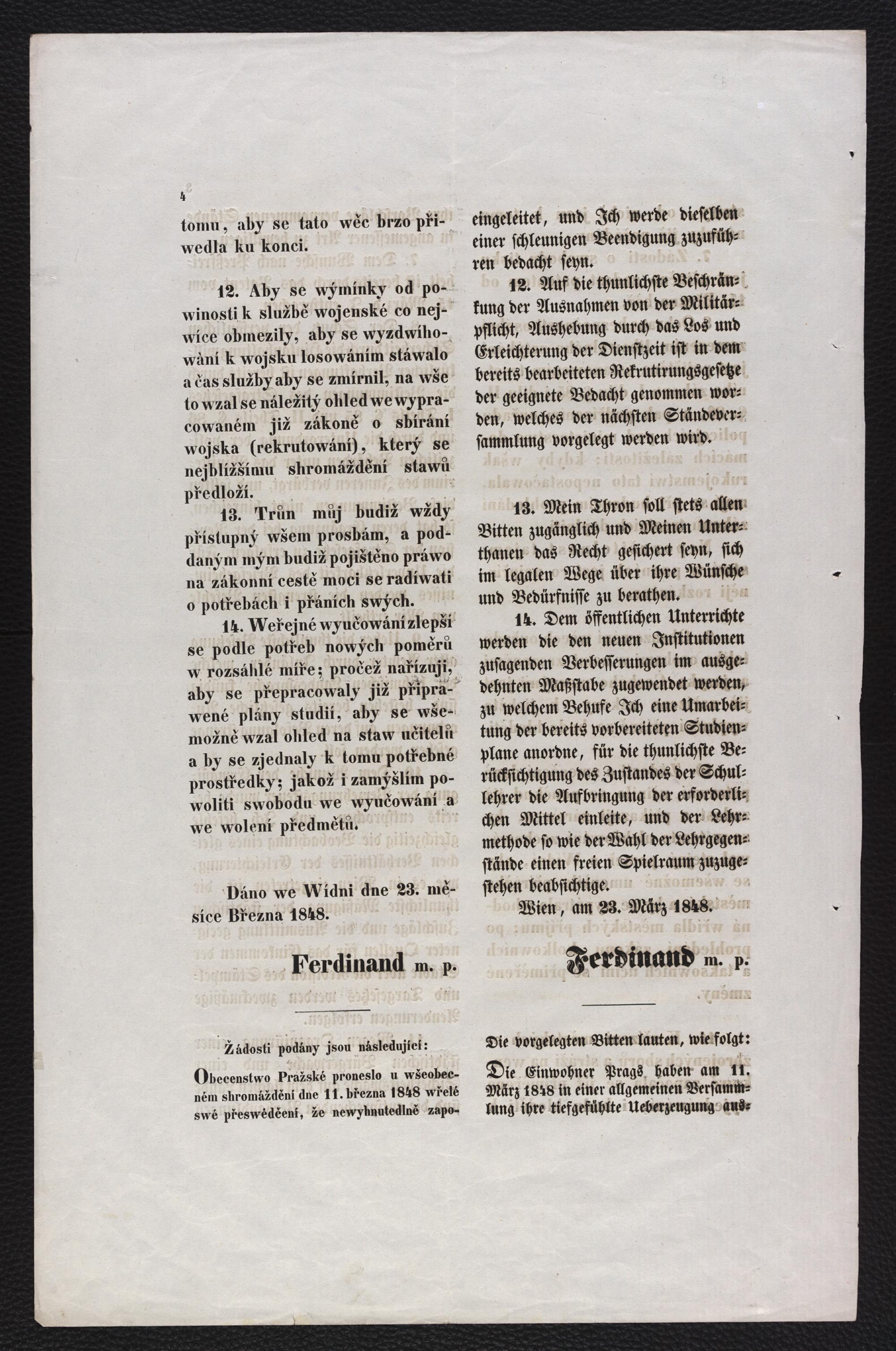 I. M. Císař Pán ráčil k žádostem dole uwedeným městanůw i občanů hlawního města Prahy následujíci nejwyšší rozhodnutí wydati ministru domácích záležitostí ... : [Dáno we Wídni dne 23. měsíce Března 1848. : Žádosti podány jsou následující: ...Wydáno we Wídni dne 24. měsíce Března 1848] = Seine Majestät der Kaiser haben über die weiter folgenden Bitten der Bürger und Einwohner der Hauptstadt Prag nachstehendes Allerhöchstes Cabinetschreiben an den Minister des Inneren zu erlassen geruhet : Lieber Freiherr von Pillersdorff! ... : [Wien, am 23. März 1848. : Die vorgelegten Bitten lauten, wie folgt: ... : Wien am 24. März 1848] / [Der Minister des Inneren: Freih. v. Pillersdorff m. p.]