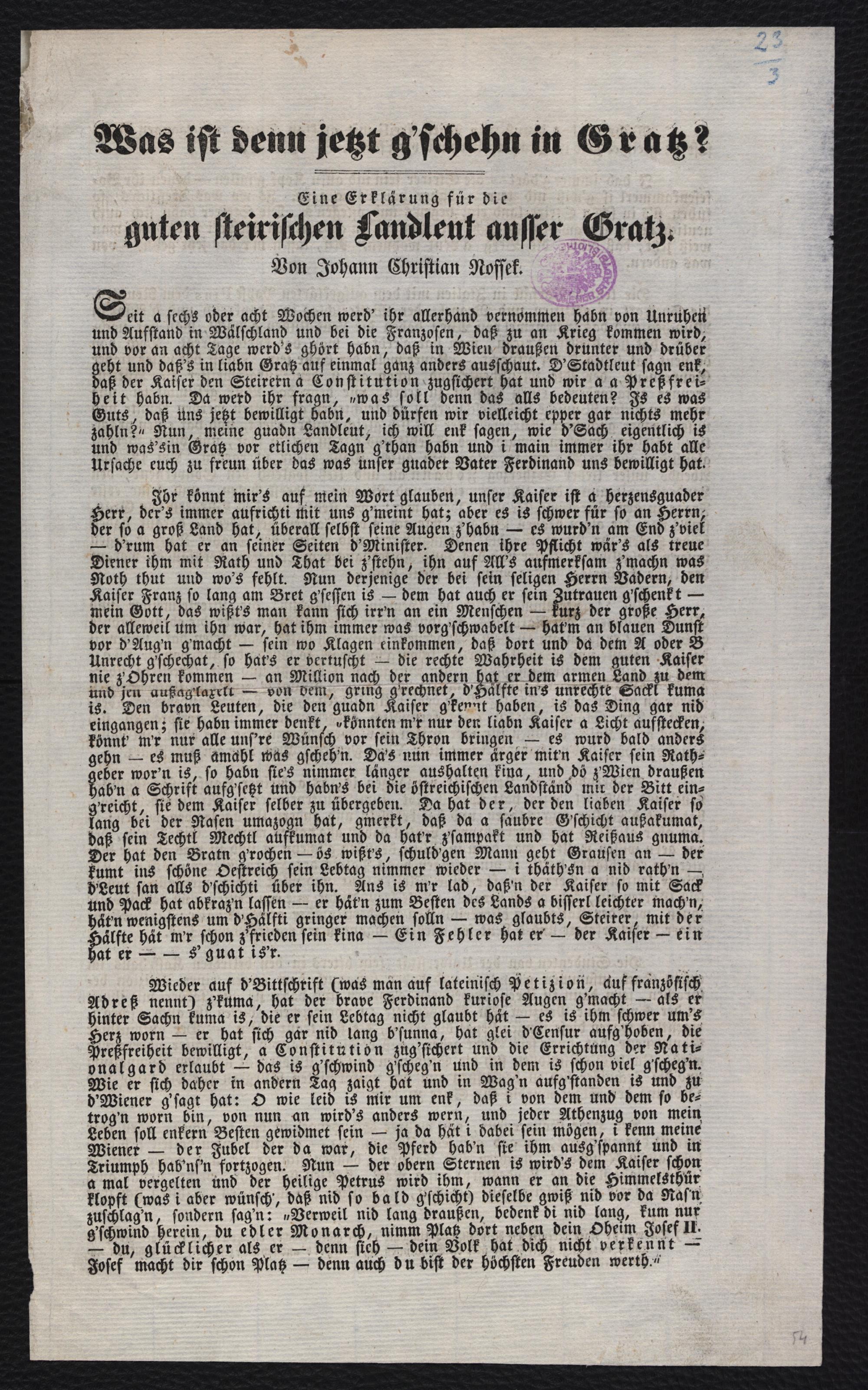 Was ist denn jetzt g'schehn in Gratz? : Eine Erklärung für die guten steirischen Landleut ausser Gratz / Von Johann Christian Nossek