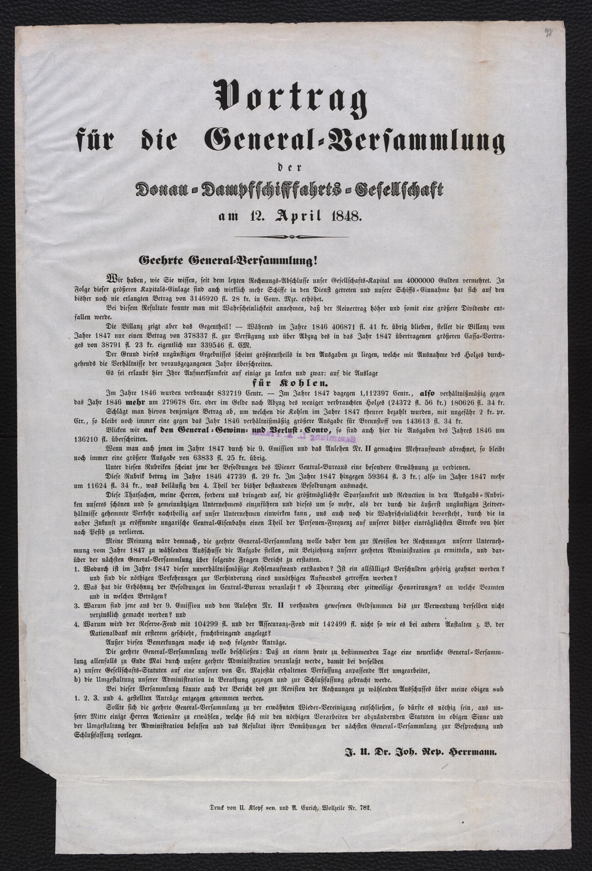 Vortrag für die General-Versammlung der Donau-Dampfschifffahrts-Gesellschaft am 12. April 1848 : Geehrte General-Versammlung! Wir haben, wie Sie wissen, seit dem letzten Rechnungs-Abschlusse unser Gesellschafts-Kapital um 4000000 Gulden vermehret. ... Bei diesem Resultate konnte man ... annehmen, daß der Reinertrag höher ... werde. Die Bilanz zeigt aber das Gegentheil! ... / J. U. Dr. Joh. Nep. Herrmann