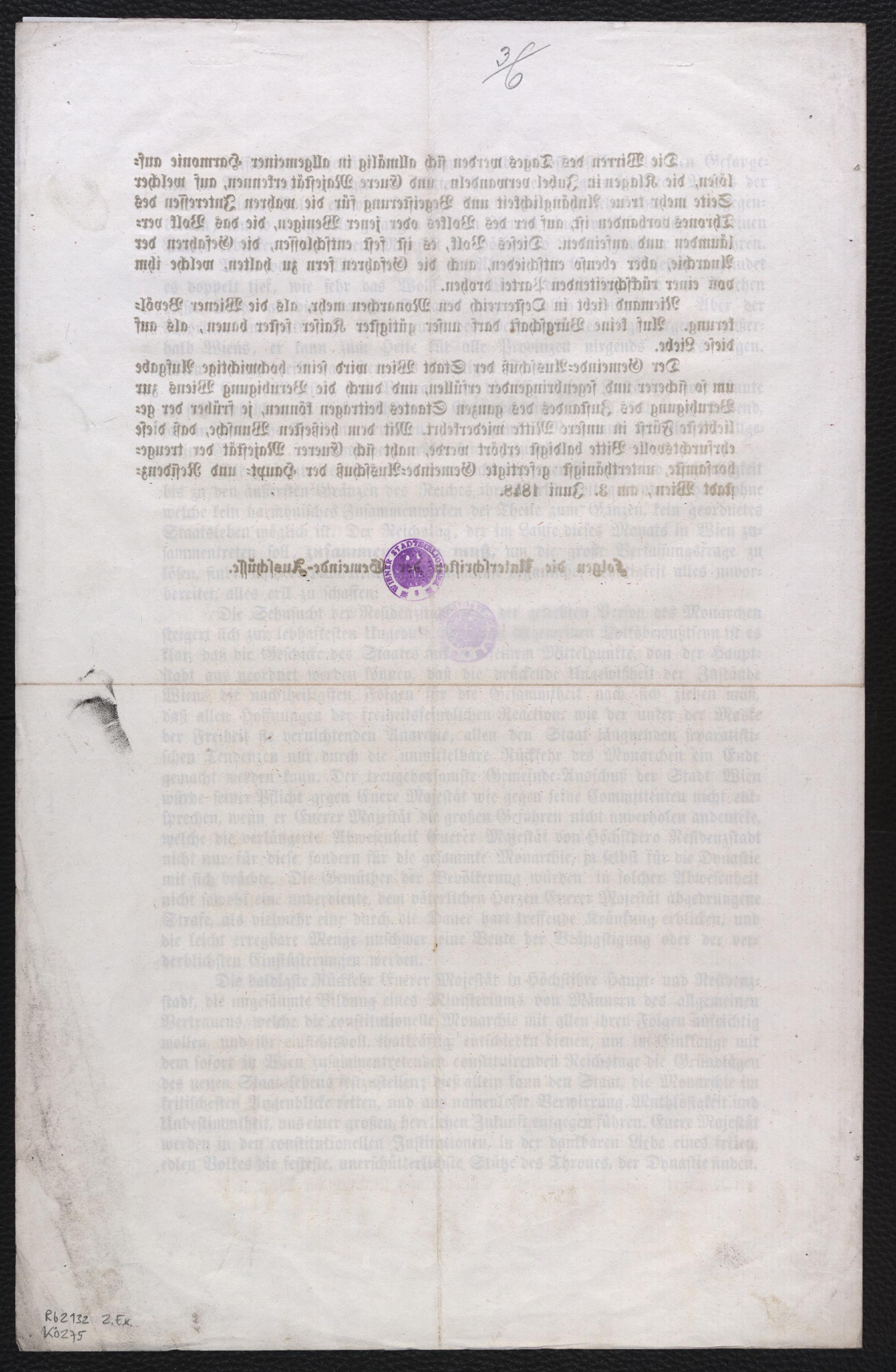 Adresse des Gemeinde-Ausschusses der Stadt Wien an Seine Majestät den Kaiser : Euere Majestät! Der neugewählte Gemeinde-Ausschuß der Haupt- und Residenzstadt Wien ... hält es beim Antritte seiner ... Mission für seine erste und dringende Pflicht, sich an Eurer Majestät in tiefster Ehrfurcht, mit vollem Vertrauen zu wenden ... Desto schmerzlicher muß es die Bevölkerung berühren, den geliebten Monarchen ... so lange von der Burg seiner Väter, von sener treuergebenen Residenz abwesend zu sehen ... / [unterthänigst gefertigte Gemeinde-Ausschuß der Haupt- und Residenzstadt Wien, am 3. Juni 1848]