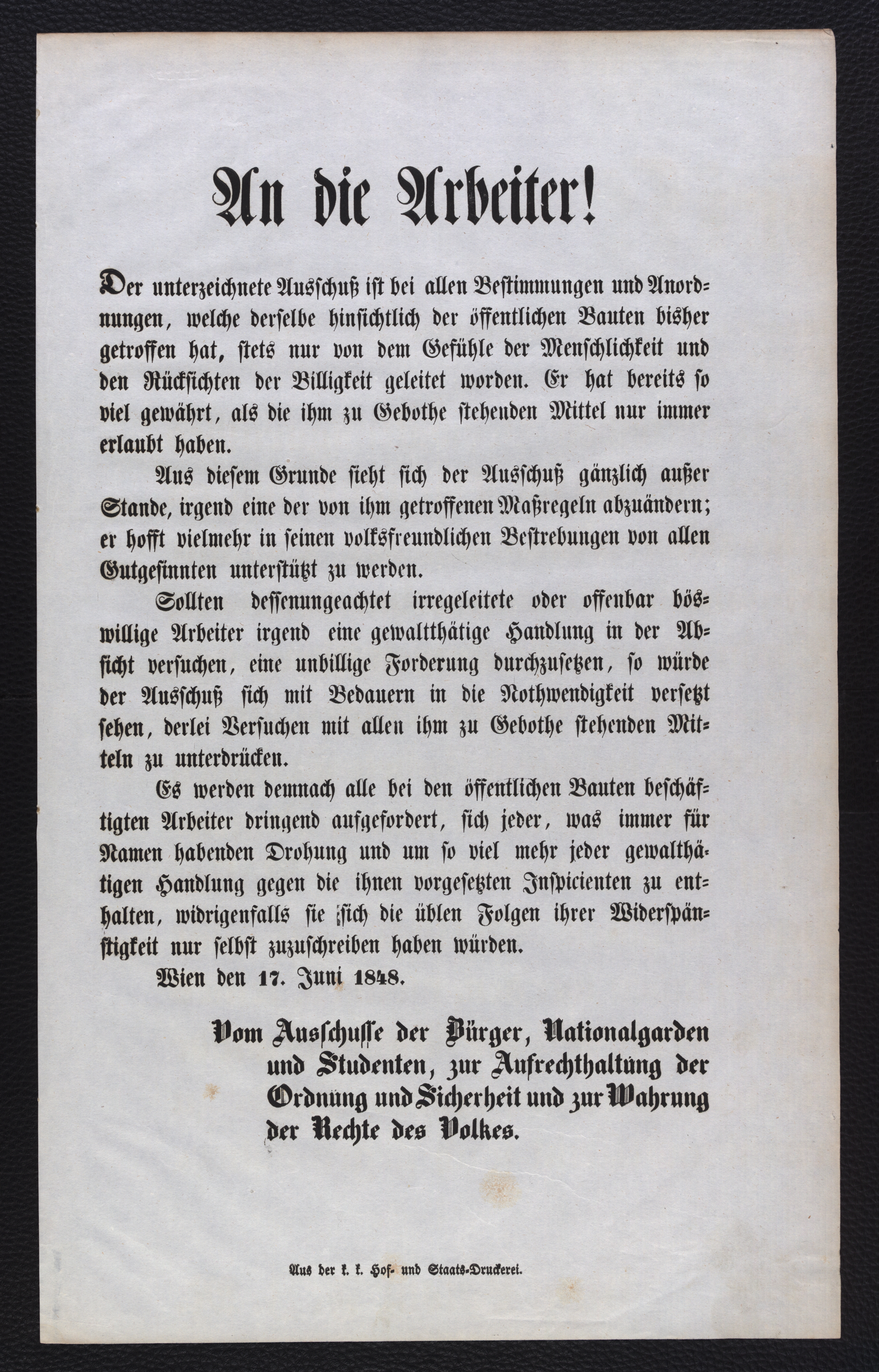 An die Arbeiter! [Wien, 17. Juni 1848] : Der unterzeichnete Ausschuß ist bei allen Bestimmungen und Anordnungen, welche derselbe hinsichtlich der öffentlichen Bauten bisher getroffen hat, stets nur von dem Gefühle der Menschlichkeit und den Rücksichten der Billigkeit geleitet worden ... ; Wien den 17. Juni 1848 / Vom Ausschusse der Bürger, Nationalgarden und Studenten zur Aufrechthaltung der Ordnung und Sicherheit und zur Wahrung der Rechte des Volkes