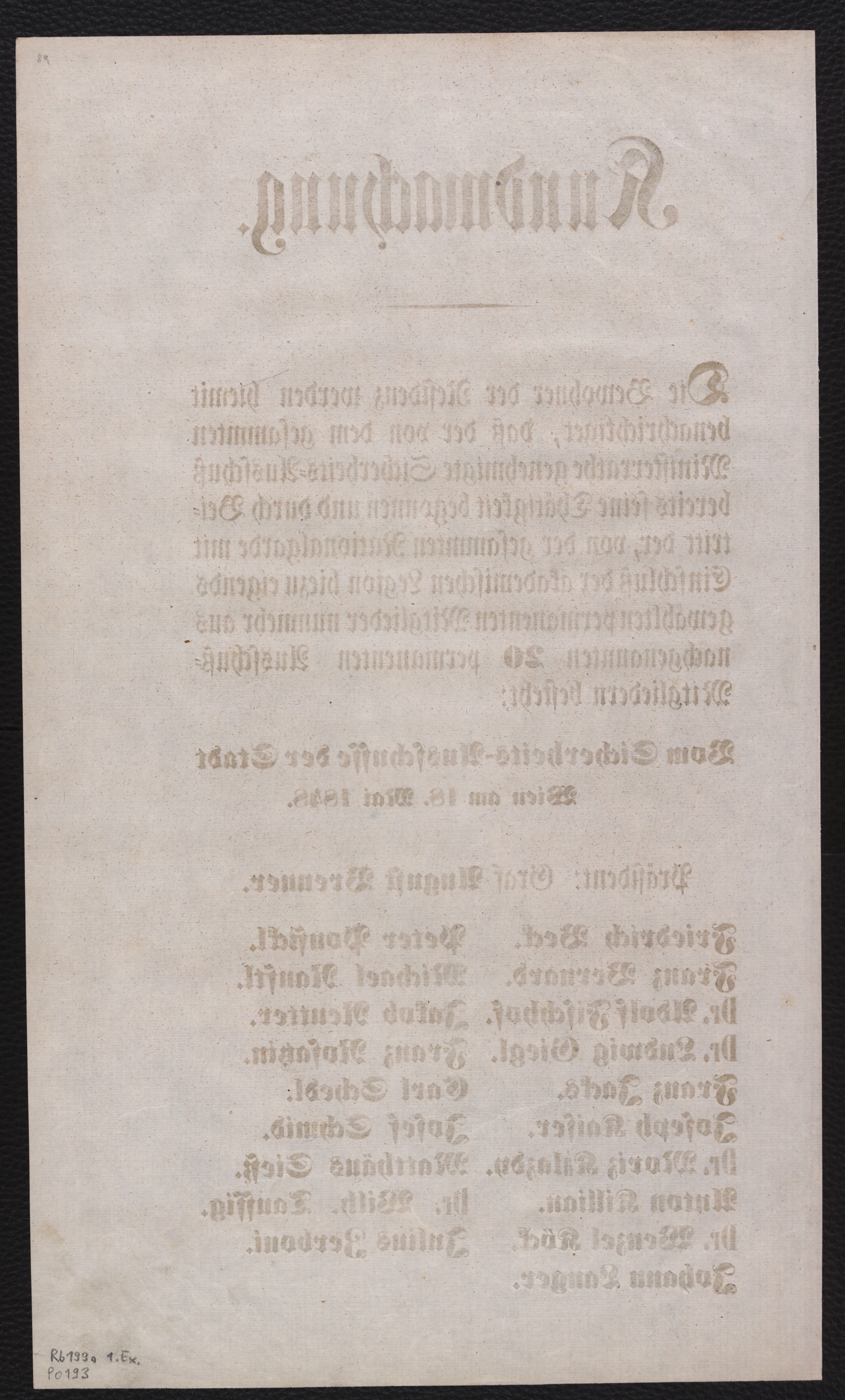 Kundmachung [Wien, 18. Mai 1848] : Die Bewohner der Residenz werden hiemit benachrichtiget, daß der von dem gesammten Ministerrathe genehmigte Sicherheits-Ausschuß bereits seine Thätigkeit begonnen ... nunmehr aus nachgenannten 20 permanten Ausschuß-Mitgliedern besteht ... / Vom Sicherheits-Ausschusse der Stadt Wien am 18. Mai 1848. Präsident: Graf August Breuner ...