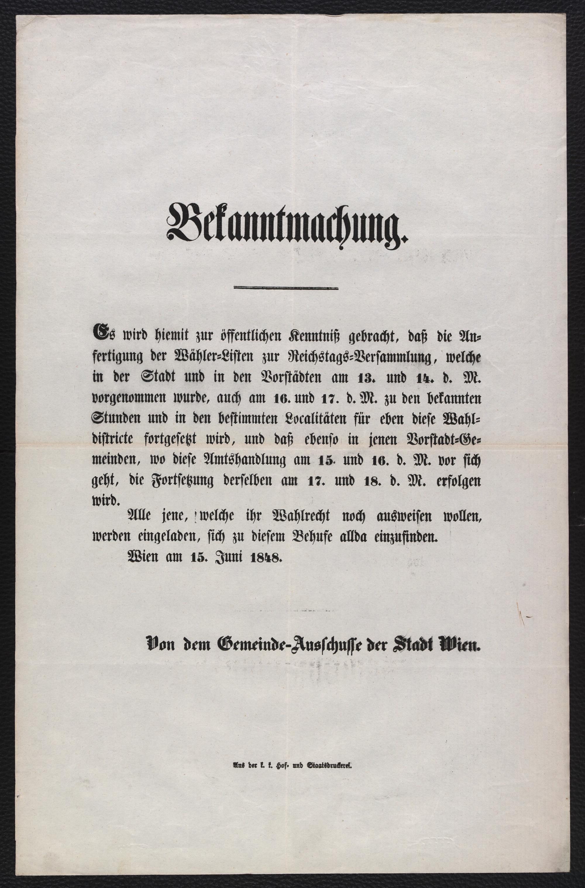 Bekanntmachung [Wien, 15. Juni 1848] : Es wird hiemit zur öffentlichen Kenntniß gebracht, daß die Anfertigung der Wähler-Listen zur Reichstags-Versammlung, welche in der Stadt und in den Vorstädten am 13. und 14. d. M. vorgenommen wurde, auch am 16. und 17. d. M. zu den bekannten Stunden und in den bestimmten Localitäten für eben diese Wahldistricte fortgesetzt wird ... ; Wien am 15. Juni 1848 / Von dem Gemeinde-Ausschusse der Stadt Wien