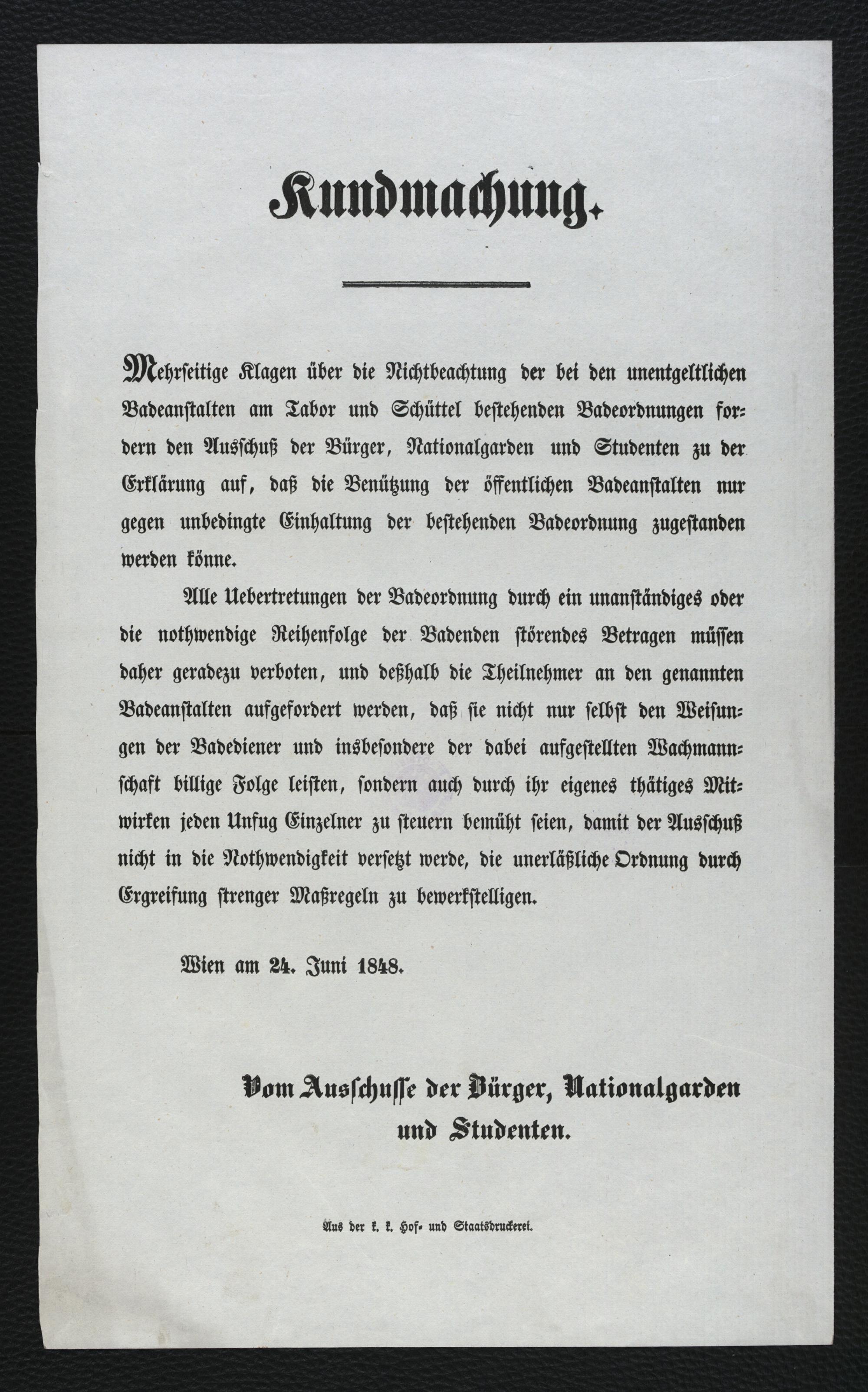 Kundmachung [Wien, 24. Juni 1848] : Mehrseitige Klagen über die Nichtbeachtung der bei den unentgeltlichen Badanstalten am Tabor und Schüttel bestehenden Badeordnungen fordern den Ausschuß der Bürger, Nationalgarden und Studenten zu der Erklärung auf, daß die Benützung der öffentlichen Badeanstalten nur gegen unbedingte Einhaltung der bestehenden Badeordnung zugestanden werden könne / Vom Ausschusse der Bürger, Nationalgarden und Studenten