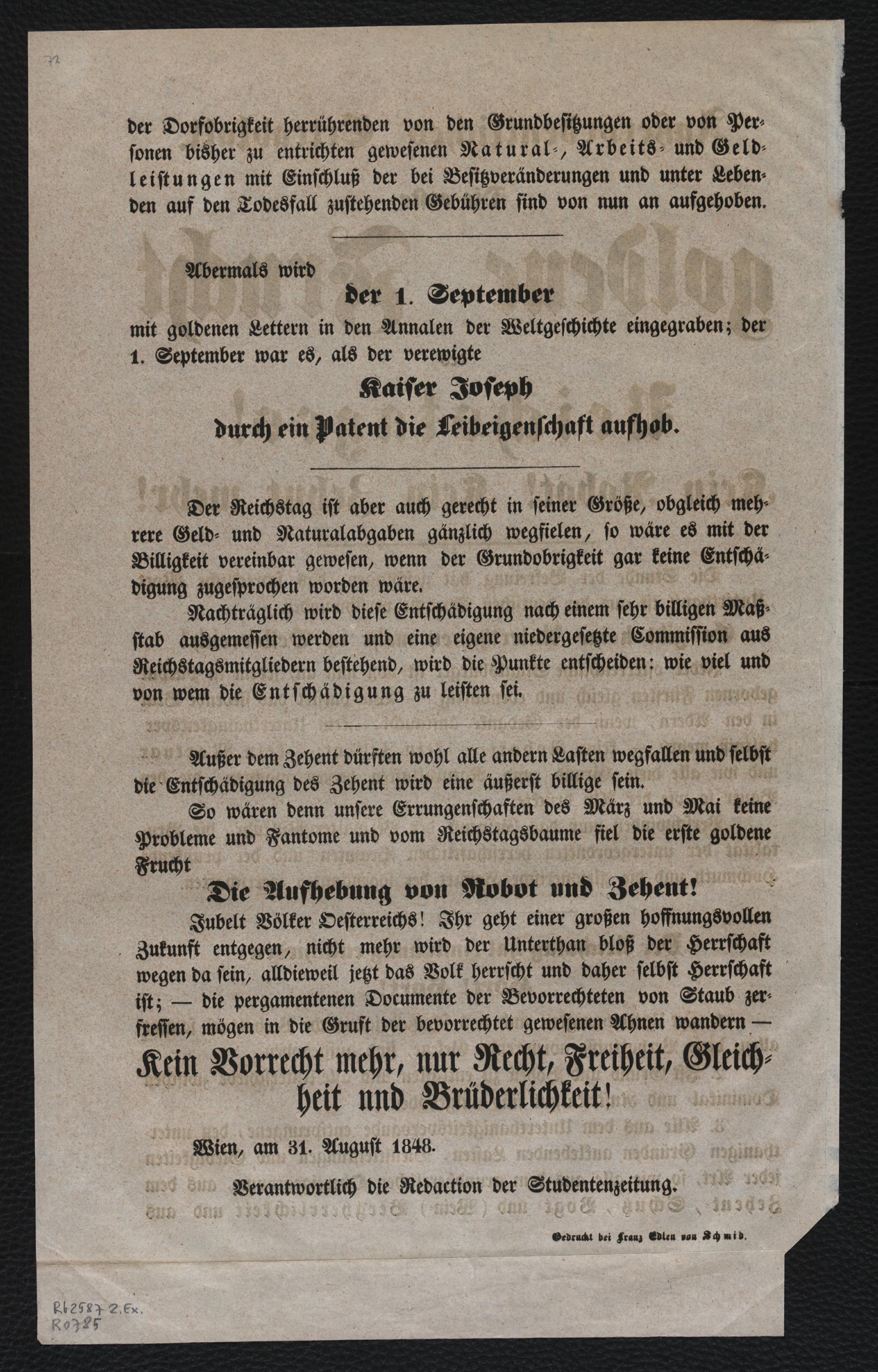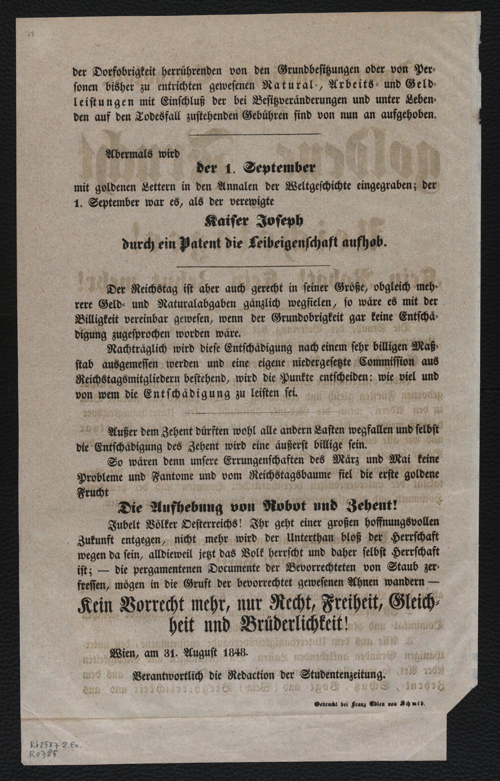 Außerordentliches Extrablatt. Die erste goldene Frucht des Reichstages! Kein Robot! Kein Zehnt mehr! : [Wien, am 31. August 1848] / [Verantwortlich die Redaction der Studentenzeitung]