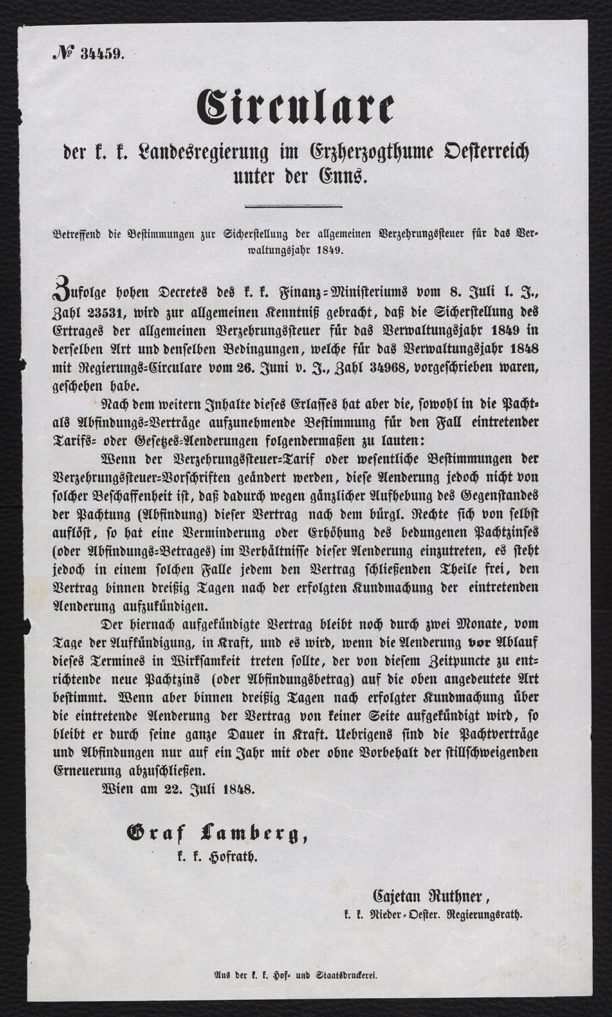 Circulare der k. k. Landesregierung im Erzherzogthume Oesterreich unter der Enns : Betreffend die Bestimmungen zur Sicherstellung der allgemeinen Verzehrungssteuer für das Verwaltungsjahr 1849. Zufolge hohen Decretes des k. k. Finanz-Ministeriums vom 8. Juli l. J., Zahl 23531 ... ; Wien am 22. Juli 1848 / Graf Lamberg, k. k. Hofrath. Cajetan Ruthner, k. k. Nieder-Oester. Regierungsrath