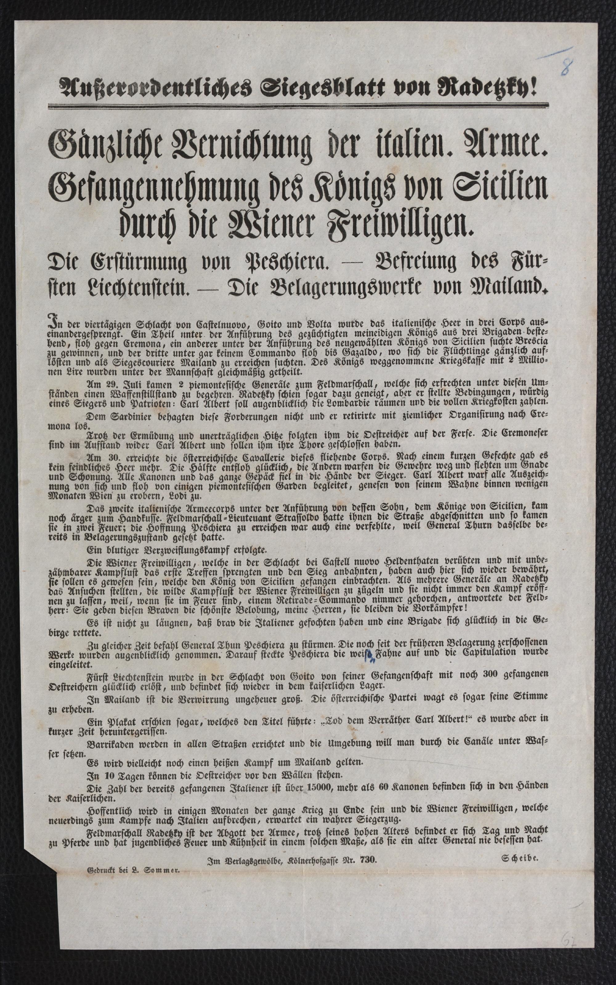 Außerordentliches Siegesblatt von Radetzky! Gänzliche Vernichtung der italien. Armee. Gefangennehmung des Königs von Sicilien durch die Wiener Freiwilligen : Die Erstürmung von Peschiera. - Befreiung des Fürsten Liechtenstein. - Die Belagerungswerke von Mailand / Scheibe