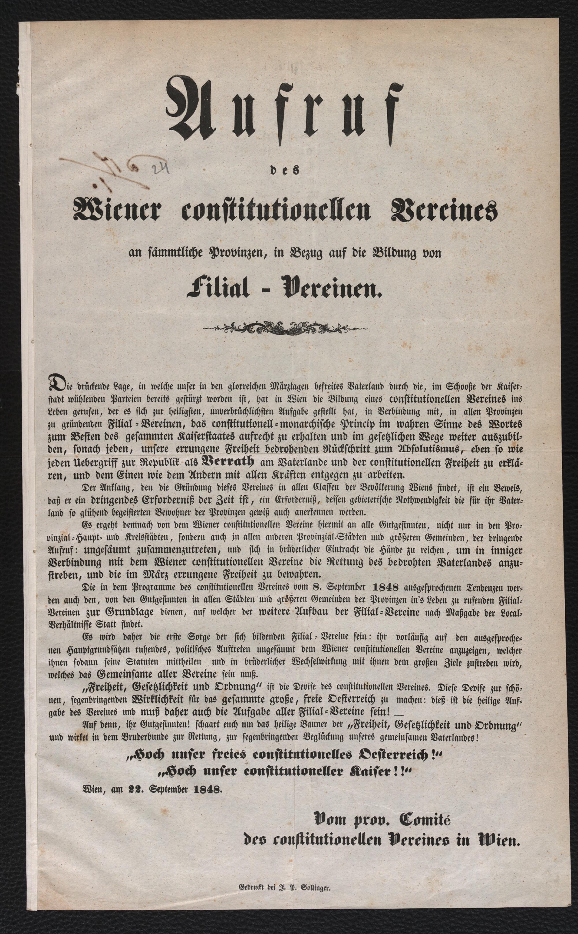 Aufruf des Wiener constitutionellen Vereines an sämmtliche Provinzen, in Bezug auf die Bildung von Filial-Vereinen : Die drückende Lage, in welche unser in den glorreichen Märztagen befreites Vaterland durch die, im Schooße der Kaiserstadt wühlenden Parteien bereits gestürzt worden ist, hat in Wien die Bildung eines constitutionellen Vereines ins Leben gerufen ... ; Wien, am 22. September 1848 / Von dem prov. Comité des constitutionellen Vereines in Wien