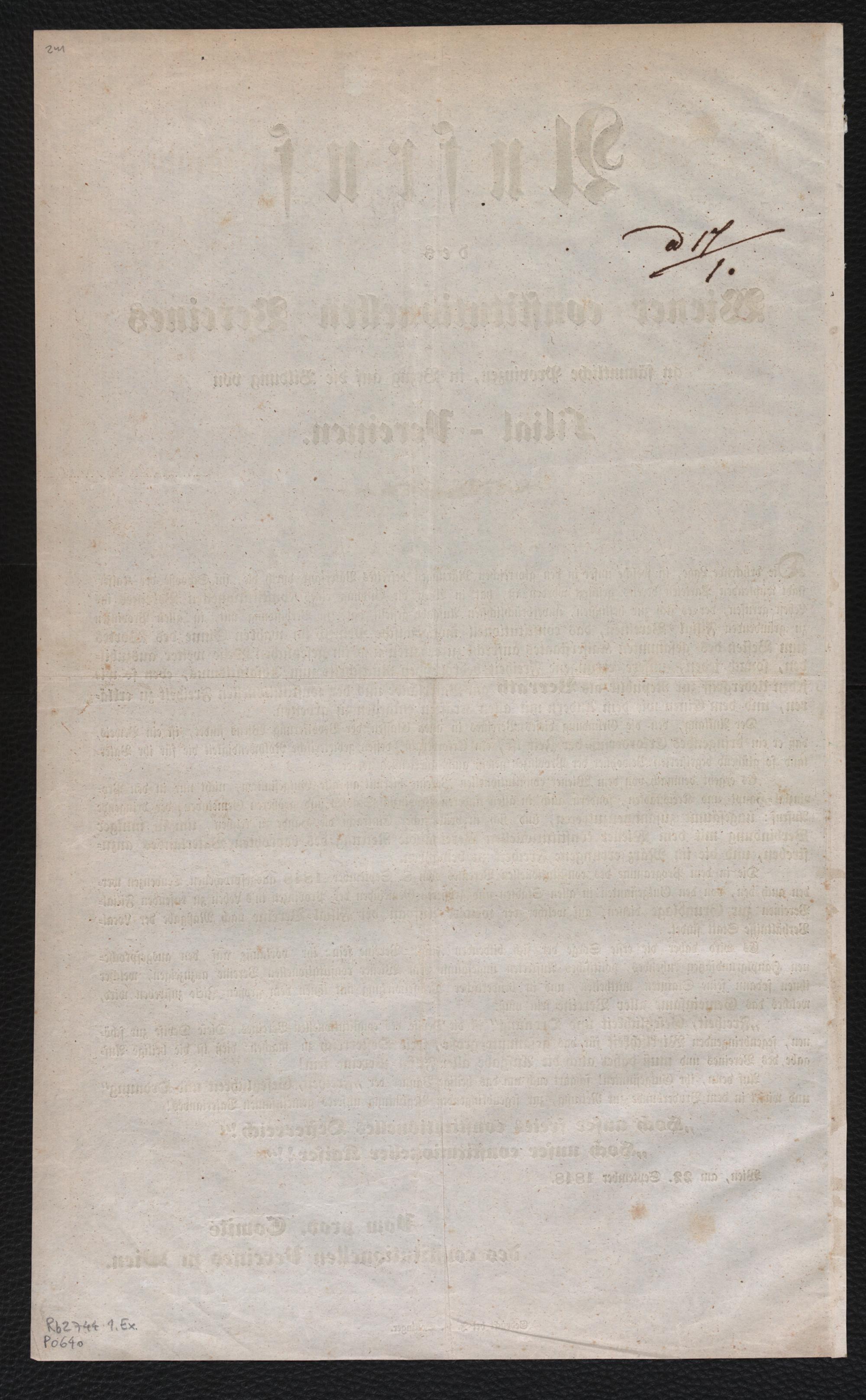 Aufruf des Wiener constitutionellen Vereines an sämmtliche Provinzen, in Bezug auf die Bildung von Filial-Vereinen : Die drückende Lage, in welche unser in den glorreichen Märztagen befreites Vaterland durch die, im Schooße der Kaiserstadt wühlenden Parteien bereits gestürzt worden ist, hat in Wien die Bildung eines constitutionellen Vereines ins Leben gerufen ... ; Wien, am 22. September 1848 / Von dem prov. Comité des constitutionellen Vereines in Wien
