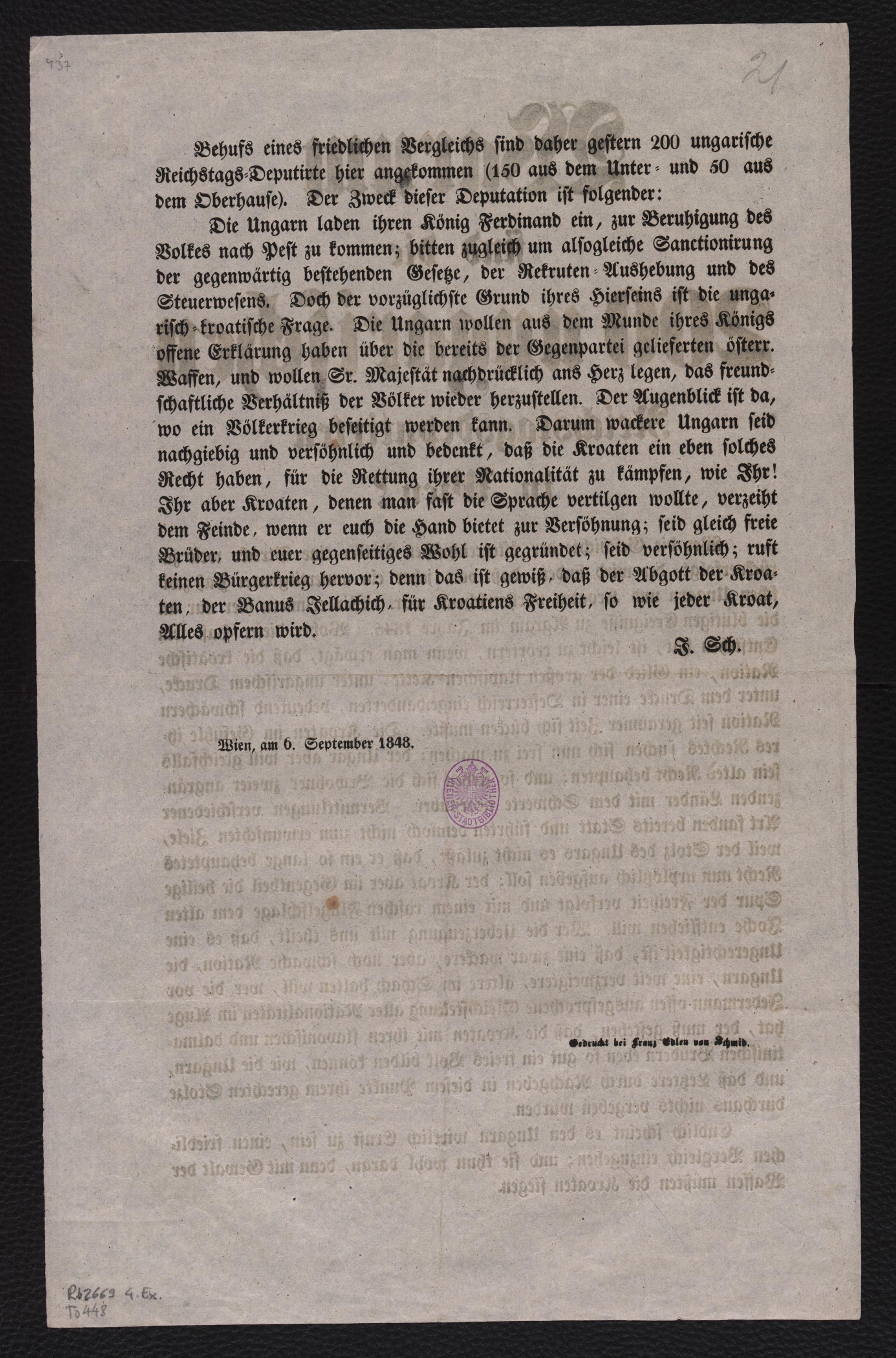 Warum sind die 200 ungarischen Reichstagsdeputirten in Wien? : Wer die Geschichte der österreichischen Völker eine Strecke weit zurückverfolgt, der wird finden, daß von jeher ein unvertilgbarer Haß zwischen Ungarn und Kroatien vorherrschend war ... ; [Wien am 6. September 1848] / [J. Sch.]