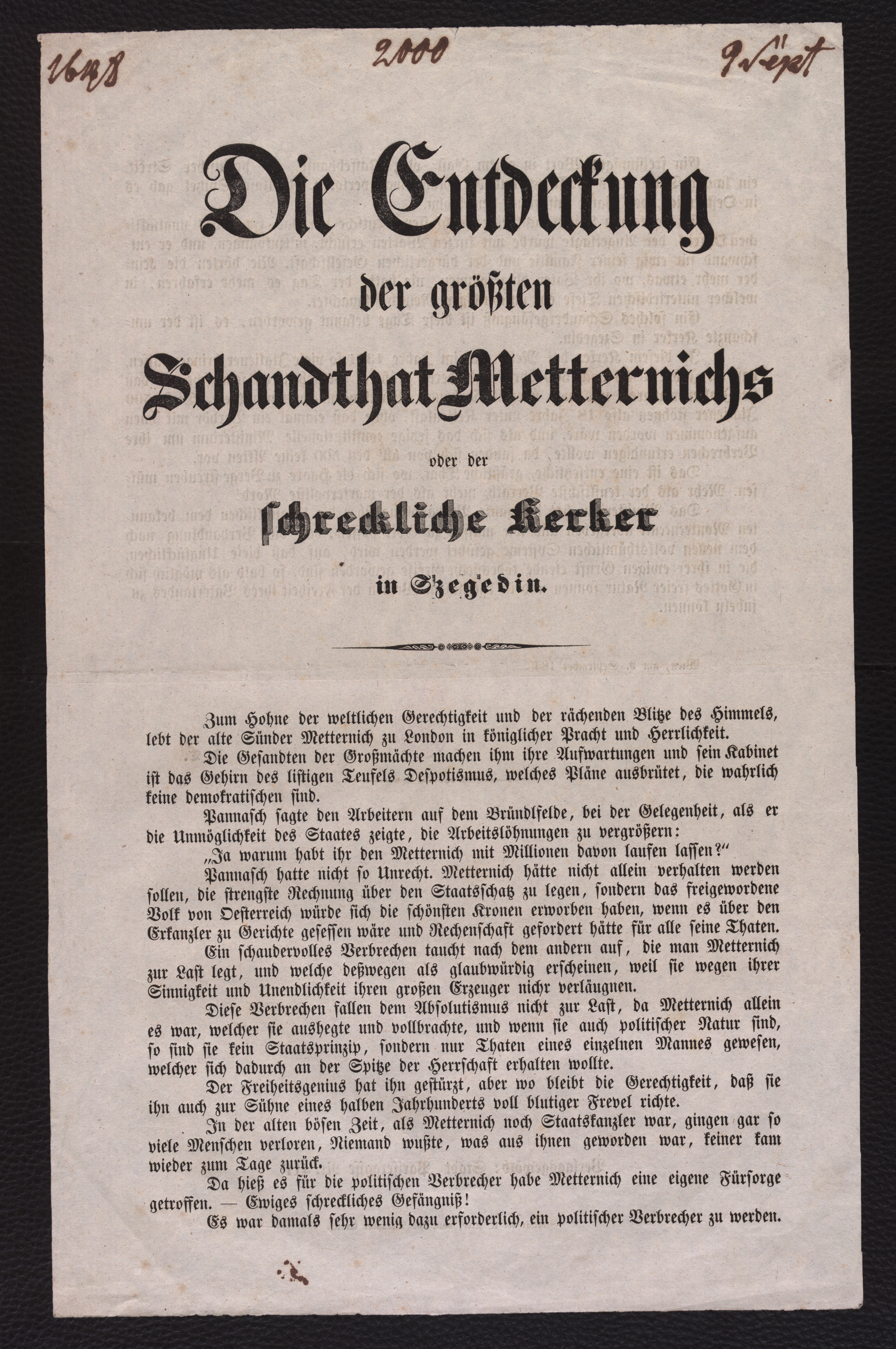 Die Entdeckung der größten Schandthat Metternichs oder der schreckliche Kerker in Szegedin : [Wien, am 9. September 1848] / [S. T.]