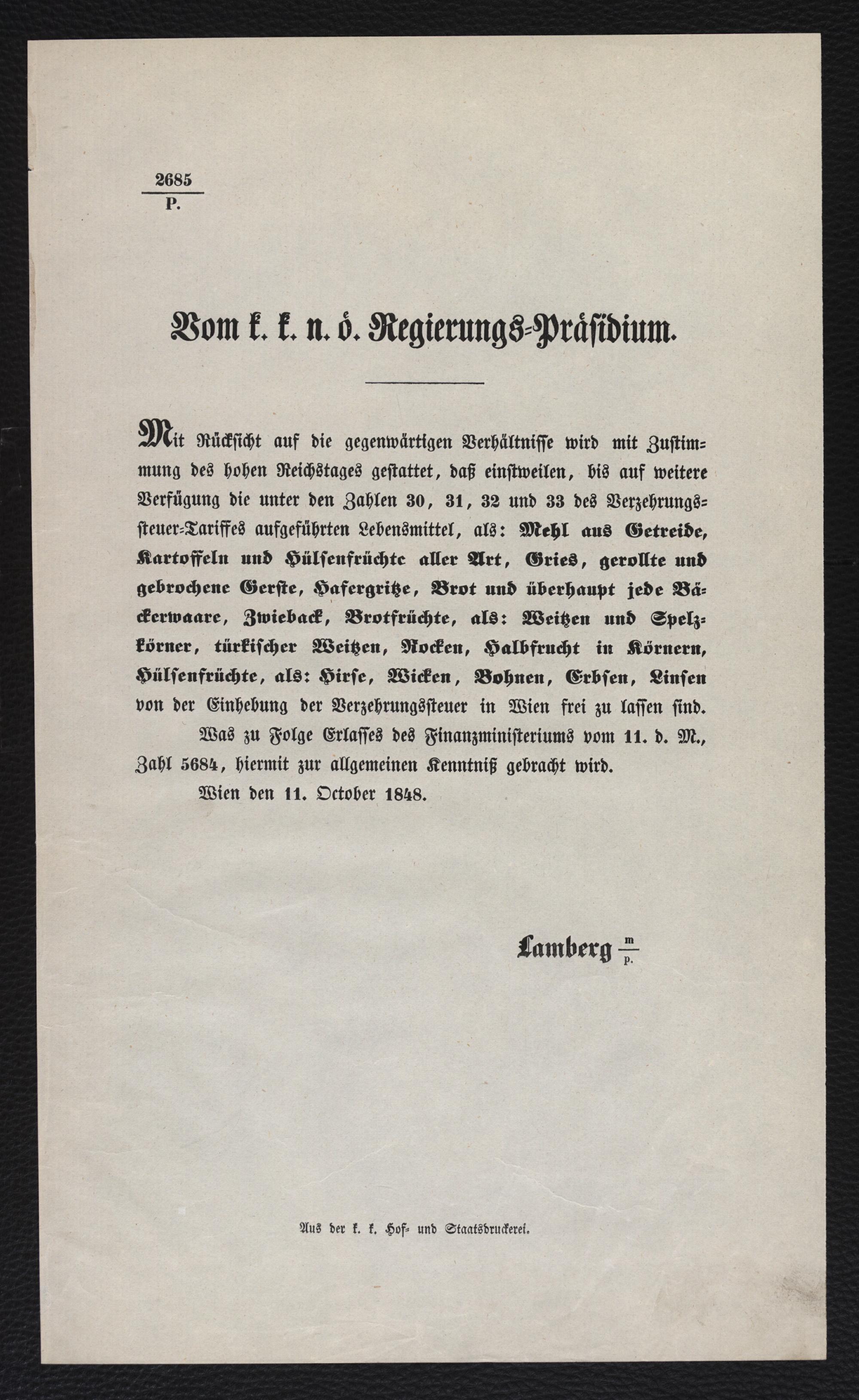 Vom k. k. n. ö. Regierungs-Präsidium : Mit Rücksicht auf die gegenwärtigen Verhältnisse wird mit Zustimmung des hohen Reichstages gestattet, daß einstweilen, bis auf weitere Verfügung die unter den Zahlen 30, 31, 32 und 33 des Verzehrungssteuer-Tariffes aufgeführten Lebensmittel, als ... von der Einhebung der Verzehrungssteuer in Wien frei zu lassen sind ... ; Wien den 11. October 1848 / Lamberg m/p.