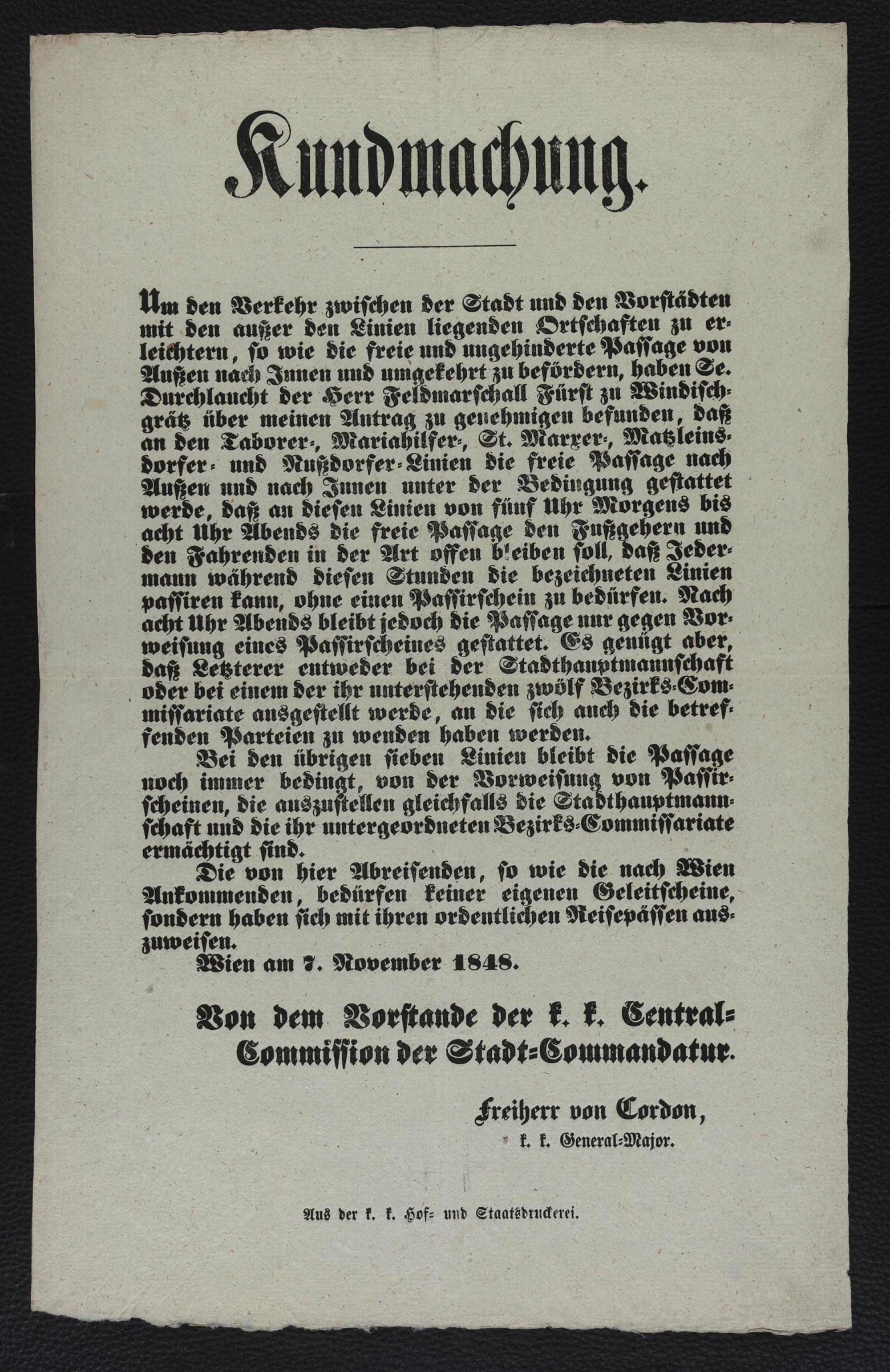 Kundmachung [Wien, 7. November 1848] : Um den Verkehr zwischen der Stadt und den Vorstädten mit den außer den Linien liegenden Ortschaften zu erleichtern, so wie die freie und ungehinderte Passage von Außen nach Innen und umgekehrt zu befördern, haben Se. Durchlaucht der Herr Feldmarschall Fürst zu Windischgrätz über meinen Antrag zu genehmigen befunden, daß an den Taborer-, Mariahilfer-, St. Marxer-, Matzleinsdorfer- und Nußdorfer-Linien die freie Passage nach Außen und nach Innen unter der Bedingung gestattet werde, daß an diesen Linien von fünf Uhr Morgens bis acht Uhr Abends die freie Passage den Fußgehern und den Fahrenden in der Art offen bleiben soll, daß Jedermann ... die bezeichneten Linien passiren kann, ohne einen Passirschein zu bedürfen ... ; Wien am 7. November 1848 / Von dem Vorstande der k. k. Central-Commission der Stadt-Commandantur. Freiherr von Cordon, k. k. General-Major