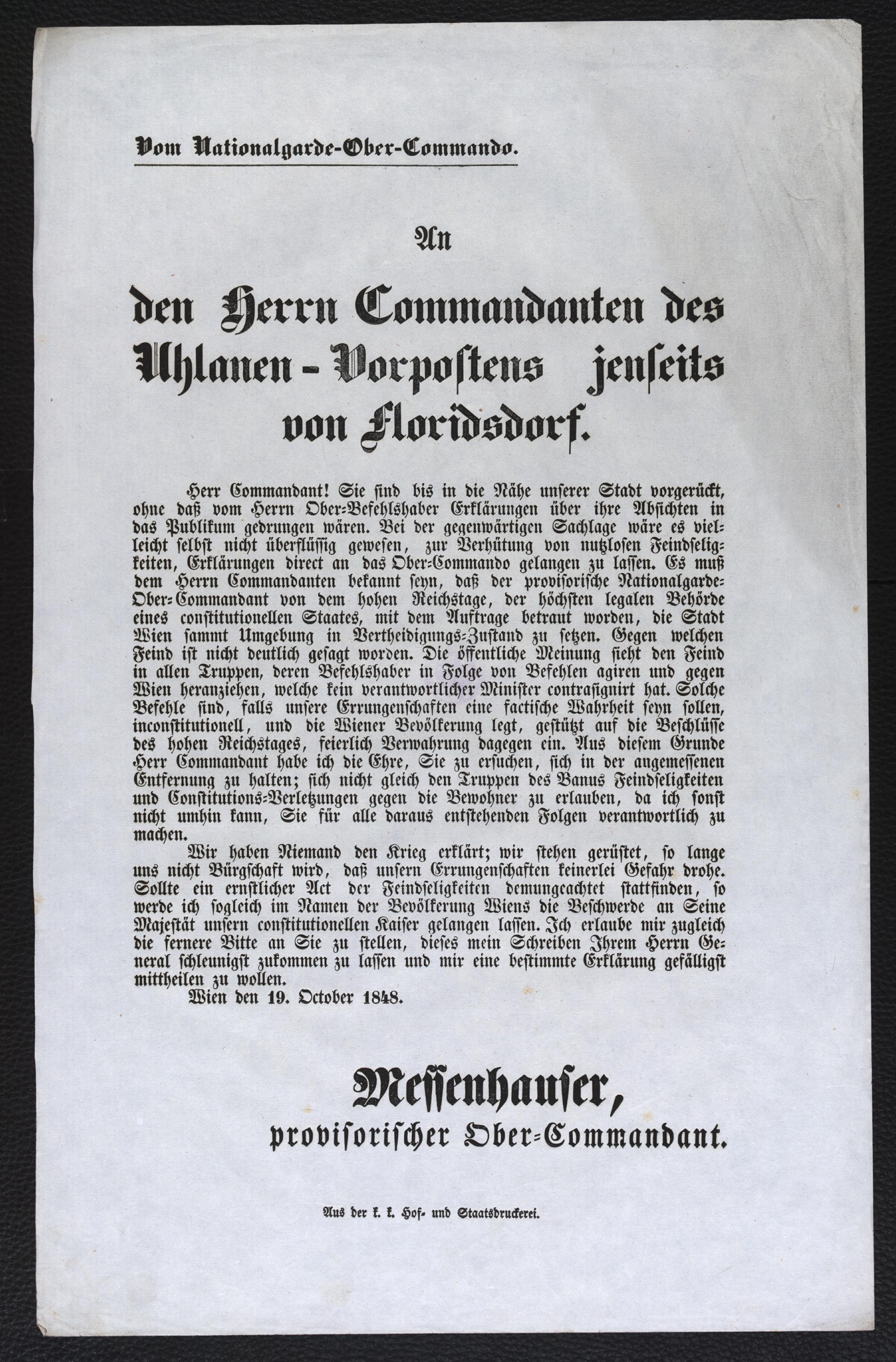 Vom Nationalgarde-Ober-Commando. An den Herrn Commandanten des Uhlanen-Vorpostens jenseits von Floridsdorf : Herr Commandant! Sie sind bis in die Nähe unserer Stadt vorgerückt, ohne daß vom Herrn Ober-Befehlshaber Erklärungen über ihre Absichten in das Publikum gedrungen wären ... ; Wien den 19. October 1848