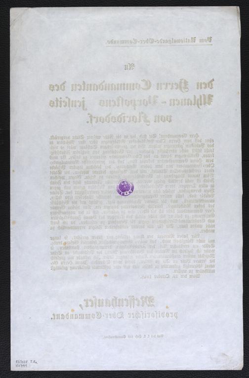 Vom Nationalgarde-Ober-Commando. An den Herrn Commandanten des Uhlanen-Vorpostens jenseits von Floridsdorf : Herr Commandant! Sie sind bis in die Nähe unserer Stadt vorgerückt, ohne daß vom Herrn Ober-Befehlshaber Erklärungen über ihre Absichten in das Publikum gedrungen wären ... ; Wien den 19. October 1848