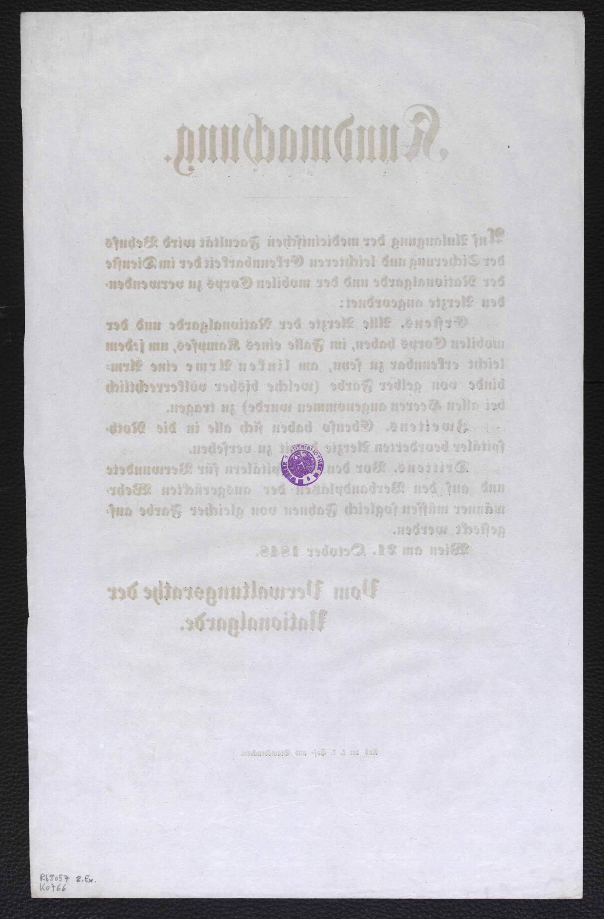 Kundmachung [Wien, 21. Oktober 1848] : Auf Anlangung der medicinischen Facultät wird Behufs der Sicherung und leichteren Erkennbarkeit der im Dienste der Nationalgarde und der mobilen Corps zu verwendenden Aerzte angeordnet ... alle Aerzte der Nationalgarde und des mobilen Corps haben ... am linken Arme eine Armbinde von gelber Farbe ... zu tragen ... ; Wien am 21. October 1848 / Vom Verwaltungsrathe der Nationalgarde