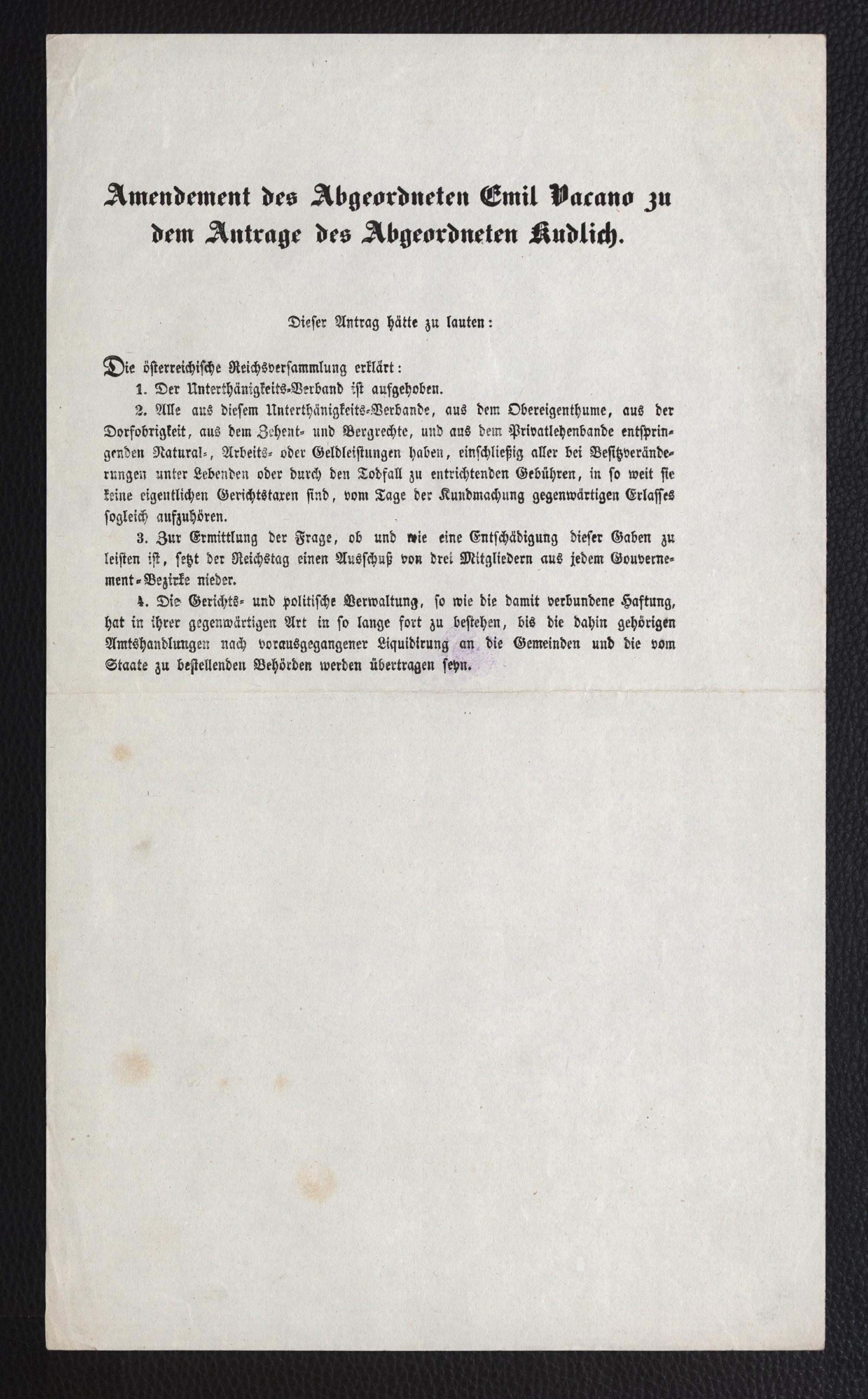 Amendement des Abgeordneten Emil Vacano zu dem Antrage des Abgeordneten Kudlich : Dieser Antrag hätte zu lauten: Die österreichische Reichsversammlung erklärt: 1. Der Unterthänigkeits-Verband ist aufgehoben. 2. Alle aus diesem Unterthänigkeits-Verbande, aus dem Obereigenthume, aus der Dorfobrigkeit, aus dem Zehent- und Bergrechte, und aus dem Privatlehenbande entspringenden Natural-, Arbeits- oder Geldleistungen haben ...