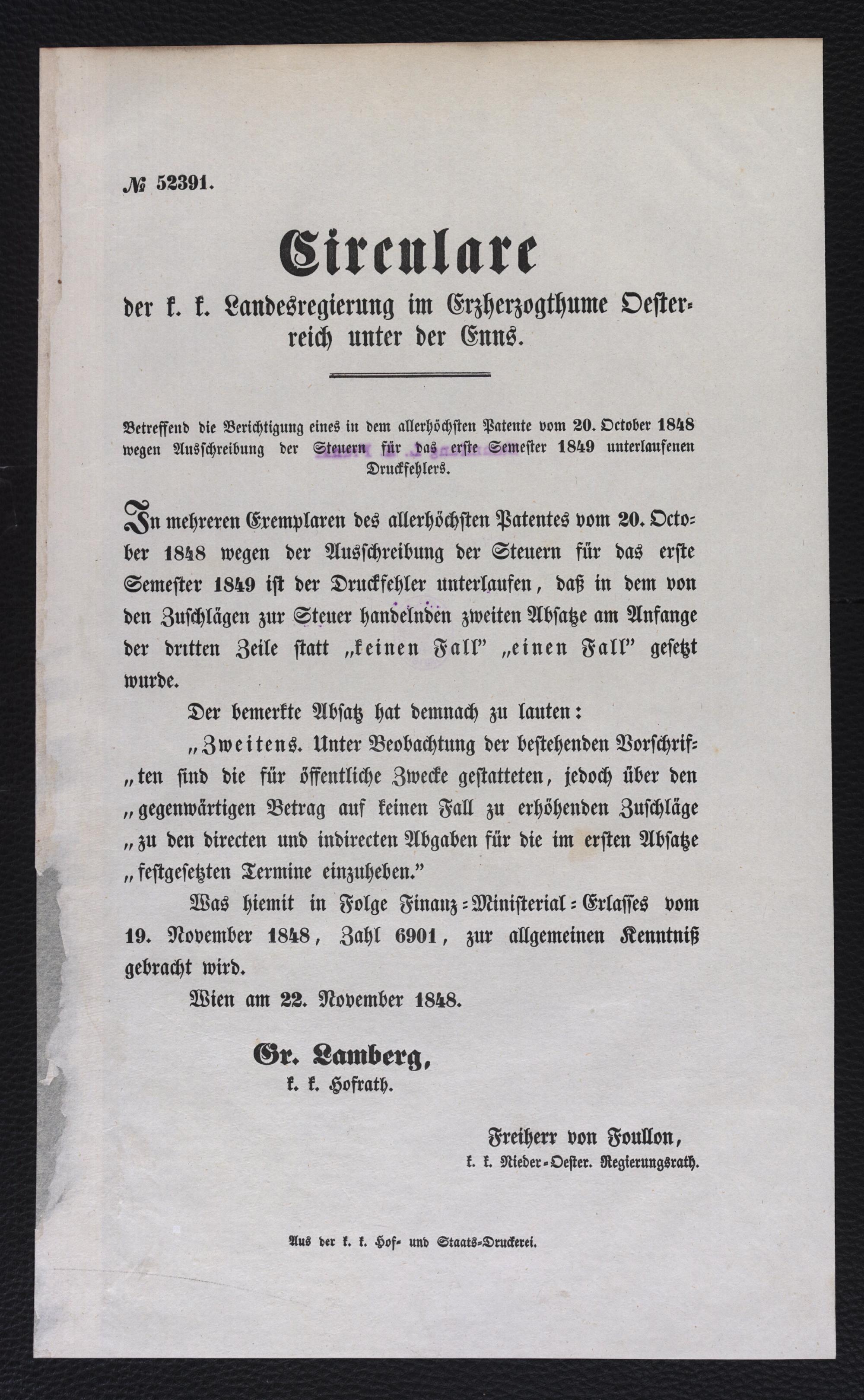 Circulare der k. k. Landesregierung im Erzherzogthume Oesterreich unter der Enns : Betreffend die Berichtigung eines in dem allerhöchsten Patente vom 20. October 1848 wegen Ausschreibung der Steuern für das erste Semester 1849 unterlaufenen Druckfehlers ; Wien am 22. November 1848. / Gr. Lamberg, k. k. Hofrath. Freiherr von Foullon, k. k. Nieder-Oester. Regierungsrath.
