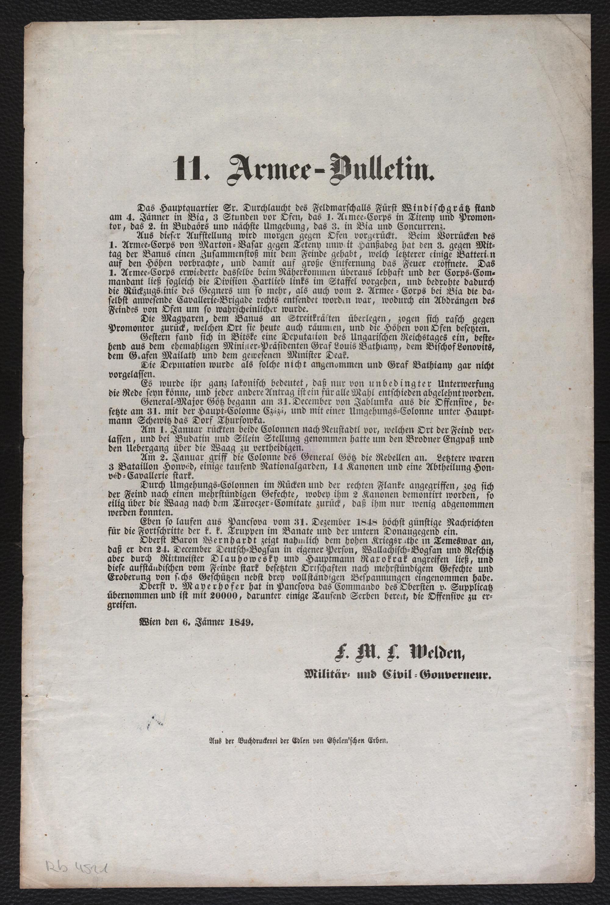 11. Armee-Bulletin : Das Hauptquartier Sr. Durchlaucht des Feldmarschalls Fürst Windischgrätz stand am 4. Jänner in Bia, 3 Stunden vor Ofen, das 1. Armee-Corps in Titeny und Promontor, das 2. in Budaörs und nächste Umgebung, das 3. in Bia und Concurrenz ... ; Wien den 6. Jänner 1849 / F. M. L. Welden, Militär- und Civil-Gouverneur
