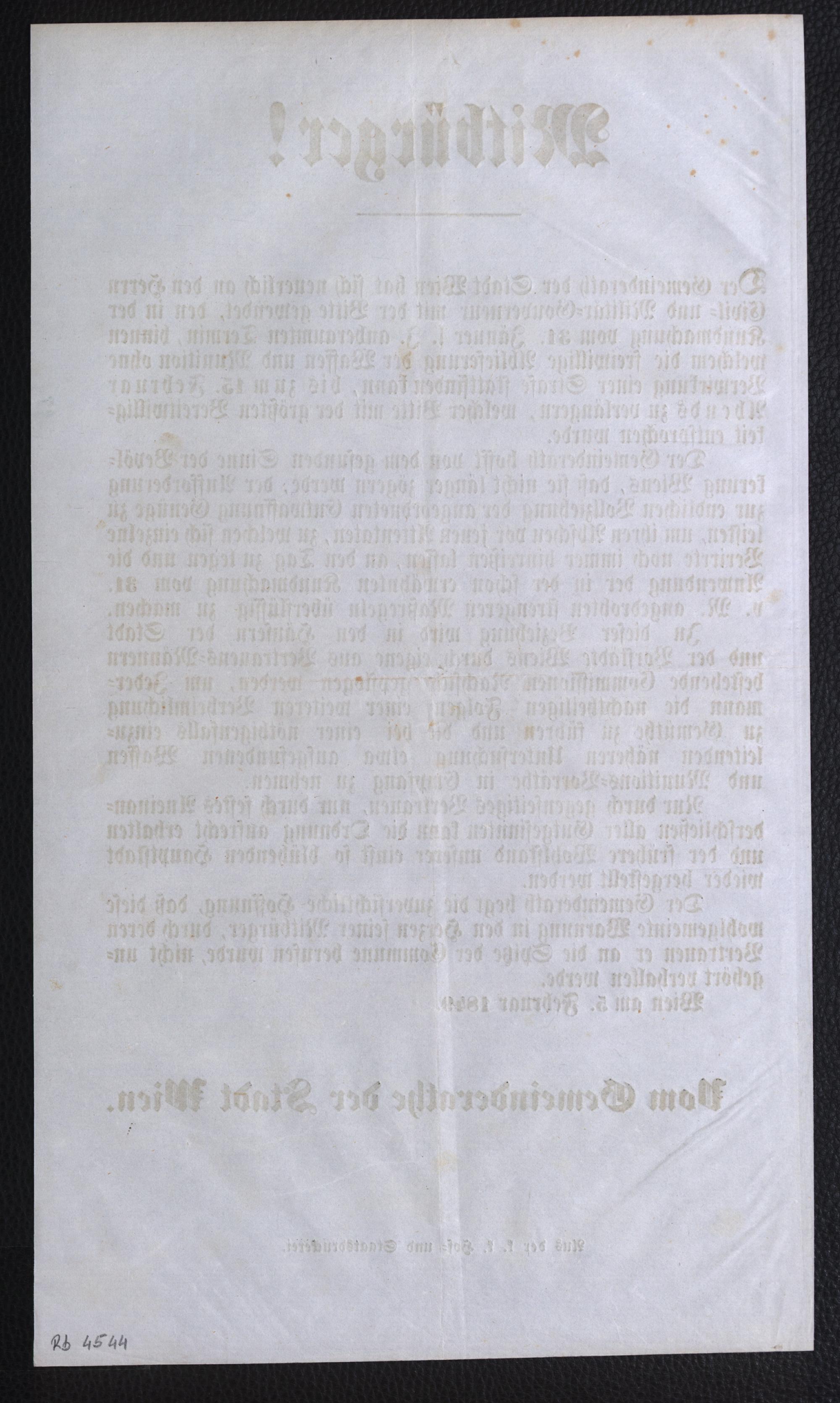 Mitbürger! : Der Gemeinderath der Stadt Wien hat sich neuerlich an den Herrn Civil- und Militär-Gouverneur mit der Bitte gewendet, den in der Kundmachung vom 31. Jänner l. J. anberaumten Termin ...bis zum 15. Februar Abend zu verlängern ... Wien am 5. Februar 1849. / Vom Gemeinderathe der Stadt Wien.