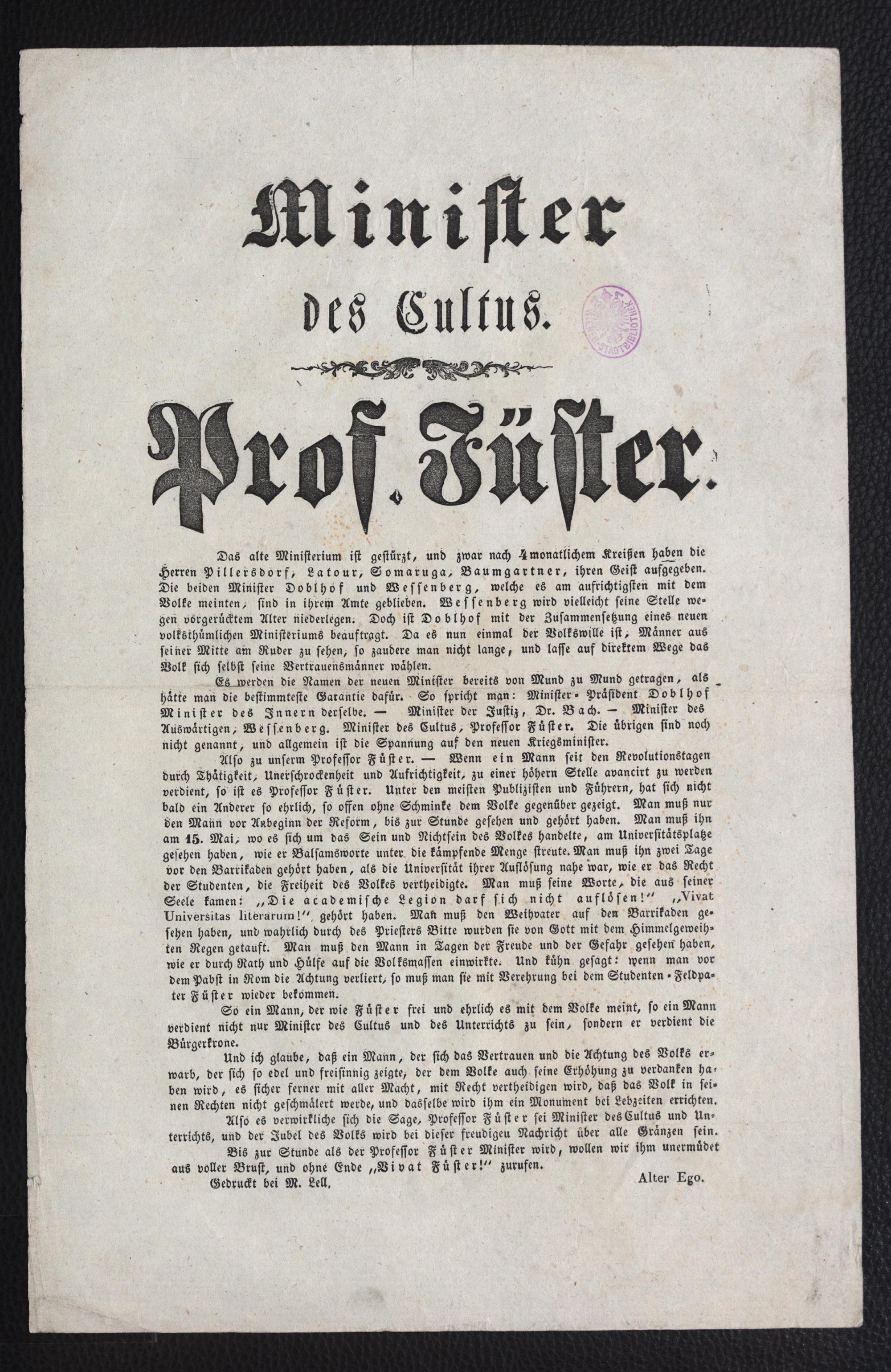 Minister des Cultus. Prof. Füster : Das alte Ministerium ist gestürzt, und zwar nach 4monatlichem Kreißen haben die Herren Pillersdorf, Latour, Somaruga, Baumgartner, ihren Geist aufgegeben. Die beiden Minister Doblhof und Wessenberg, welche es am aufrichtigsten mit dem Volke meinten, sind in ihrem Amte geblieben / Alterego