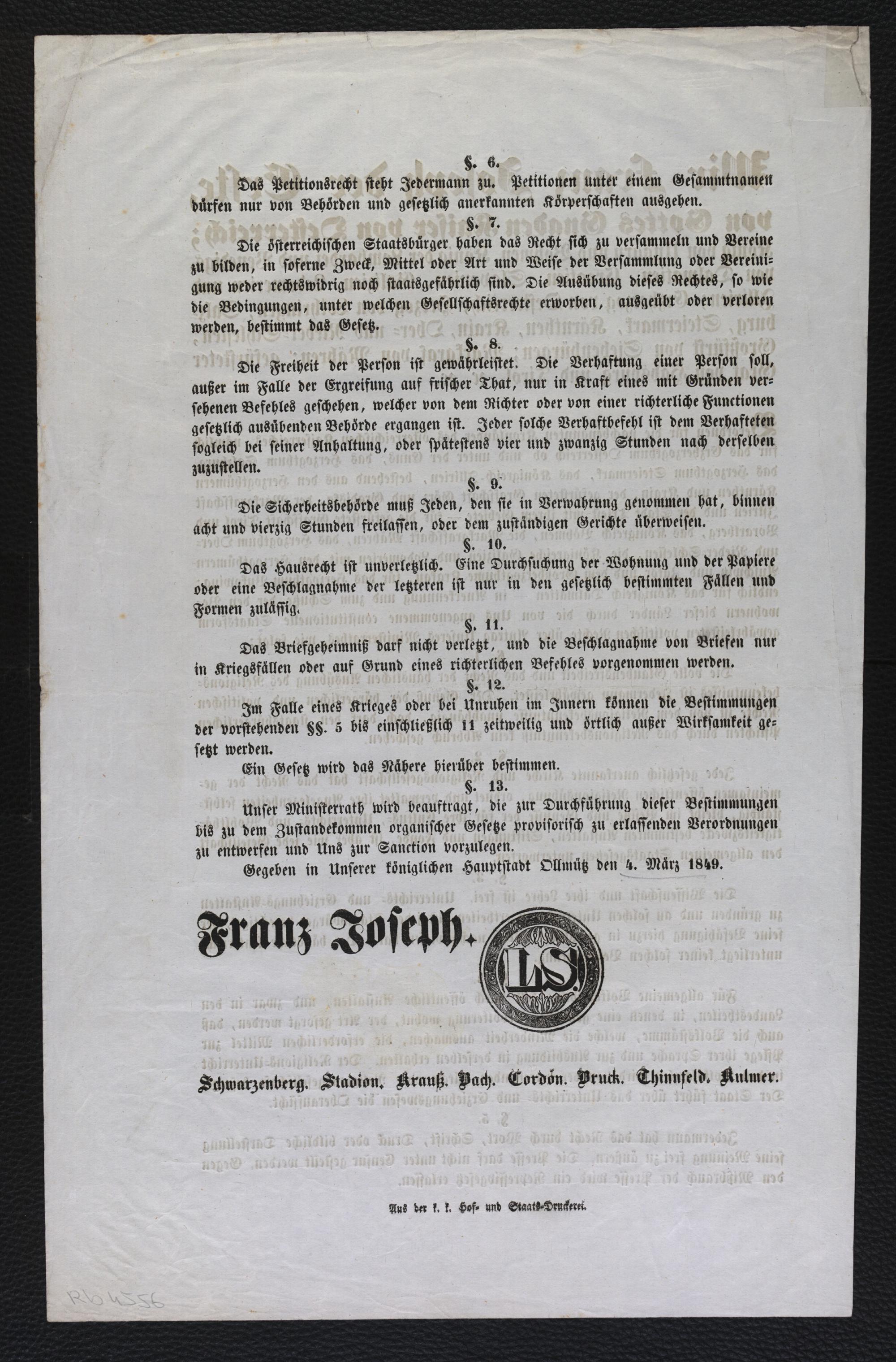 Wir Franz Joseph der Erste, von Gottes Gnaden Kaiser von Österreich ... Verordnen für die nachbenannten Kronländer des österreichischen Kaiserreiches ... 1849 : [Gegeben in Unserer königlichen Hauptstadt Ollmütz den 4. März] / [Franz Joseph. Schwarzenberg. Stadion. Krauß. Bach. Cordon. Bruck. Thinnfeld. Kulmer]
