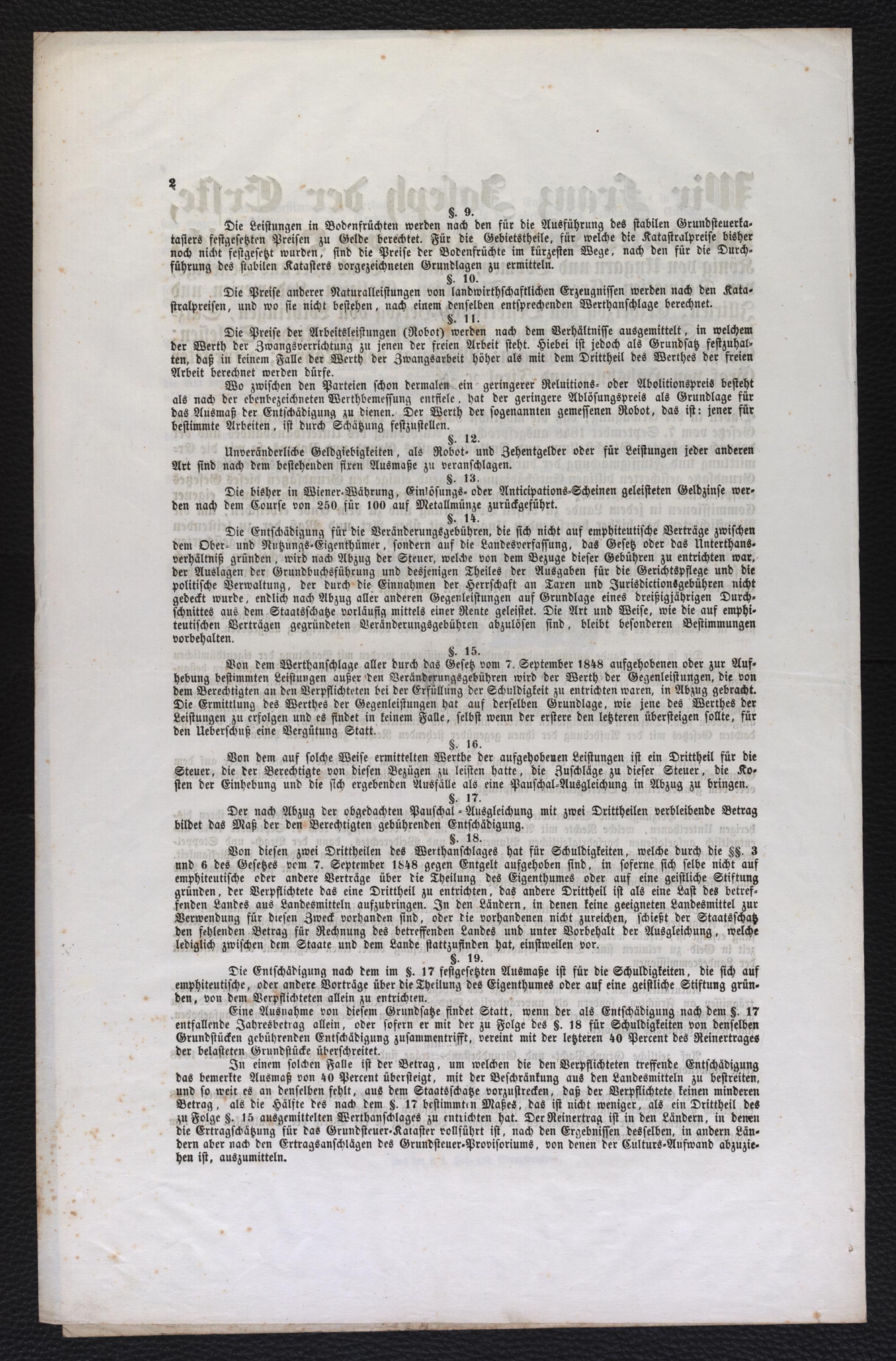 Wir Franz Joseph der Erste, von Gottes Gnaden Kaiser von Österreich ... Haben in der Erwägung, daß die möglichst baldige Durchführung der in dem Gesetze vom 7. September 1848 ausgesprochenen Aufhebung des Unterthansbandes und der dadurch gewährten Gleichstellung und entlastung alles Grund und Bodens ... : [Gegeben in Unserer königl. Hauptstadt Ollmütz den 4. März 1849] / [Franz Joseph. Schwarzenberg. Stadion. Krauß. Bach. Cordon. Bruck. Thinnfeld. Kulmer]