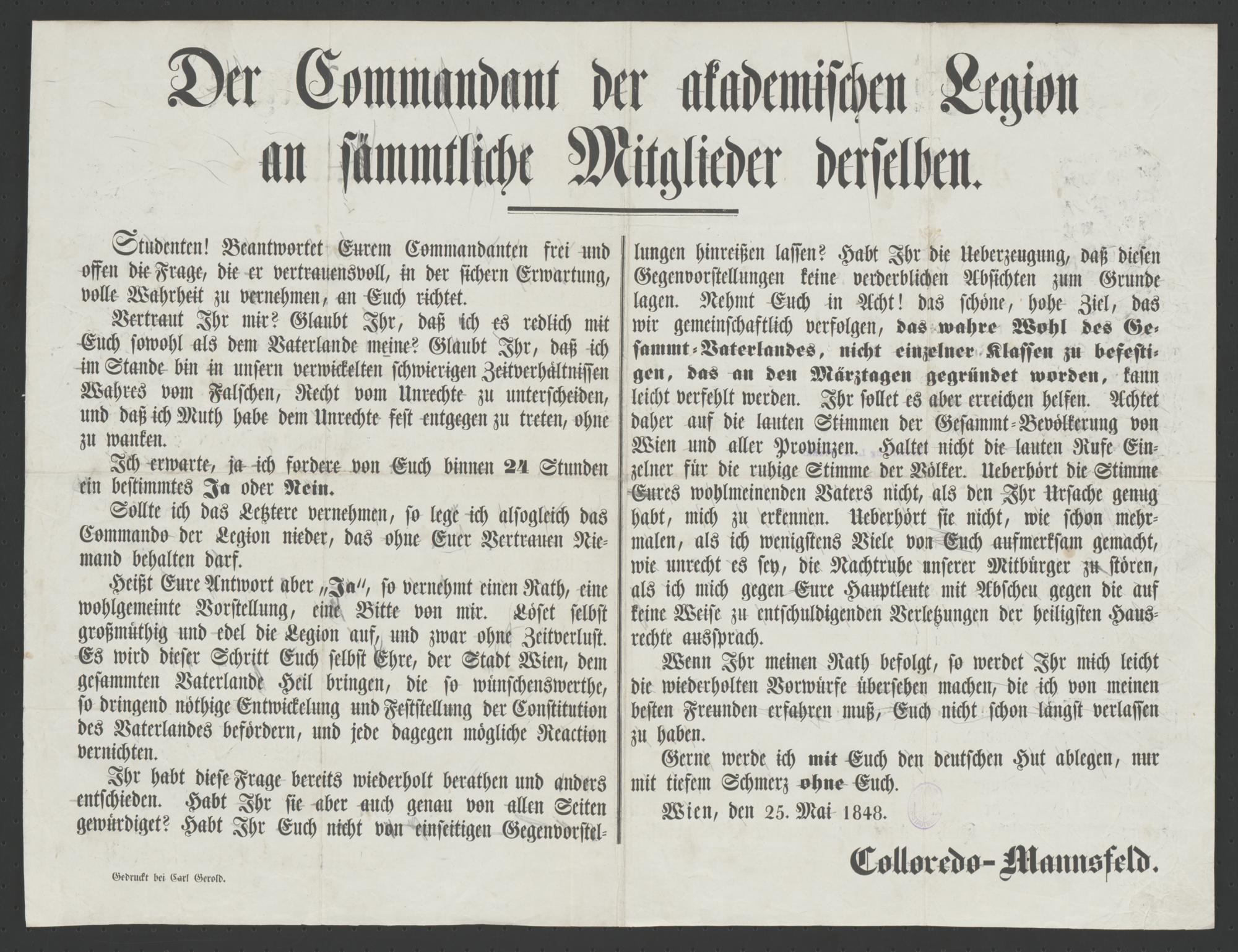 Der Commandant der akademischen Legion an sämmtliche Mitglieder derselben : Studenten! Beantwortet Eurem Commandanten frei und offen die Frage, die er vertrauensvoll, in der sicheren Erwartung, volle Wahrheit zu vernehmen, an Euch richtet ... Wien, den 25. Mai 1848 / Colloredo-Mannsfeld
