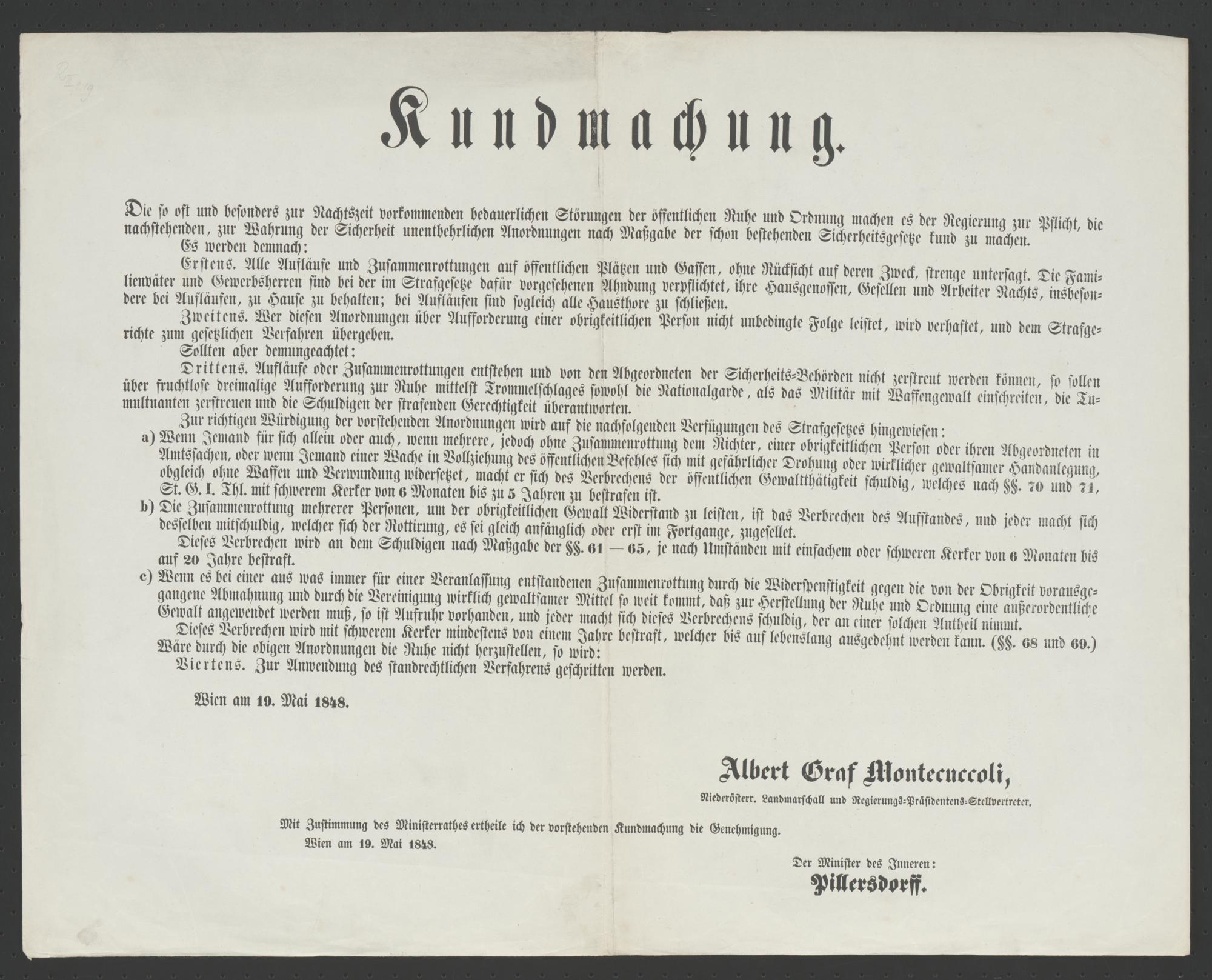 Kundmachung [Wien, 19. Mai 1848] : Die so oft und besonders zur Nachtszeit vorkommenden bedauerlichen Störungen der öffentlichen Ruhe und Ordnung machen es der Regierung zur Pflicht, die nachstehenden, zur Wahrung der Sicherheit unentbehrlichen Anordnungen nach Maßgabe der schon bestehenden Sicherheitsgesetze kund zu machen ... [Wien am 19. Mai 1848.] / Albert Graf Montecuccoli, Niederösterr. Landmarschall und Regierungs-Präsidentens-Stellvertreter ... Der Minister des Inneren: Pillersdorff