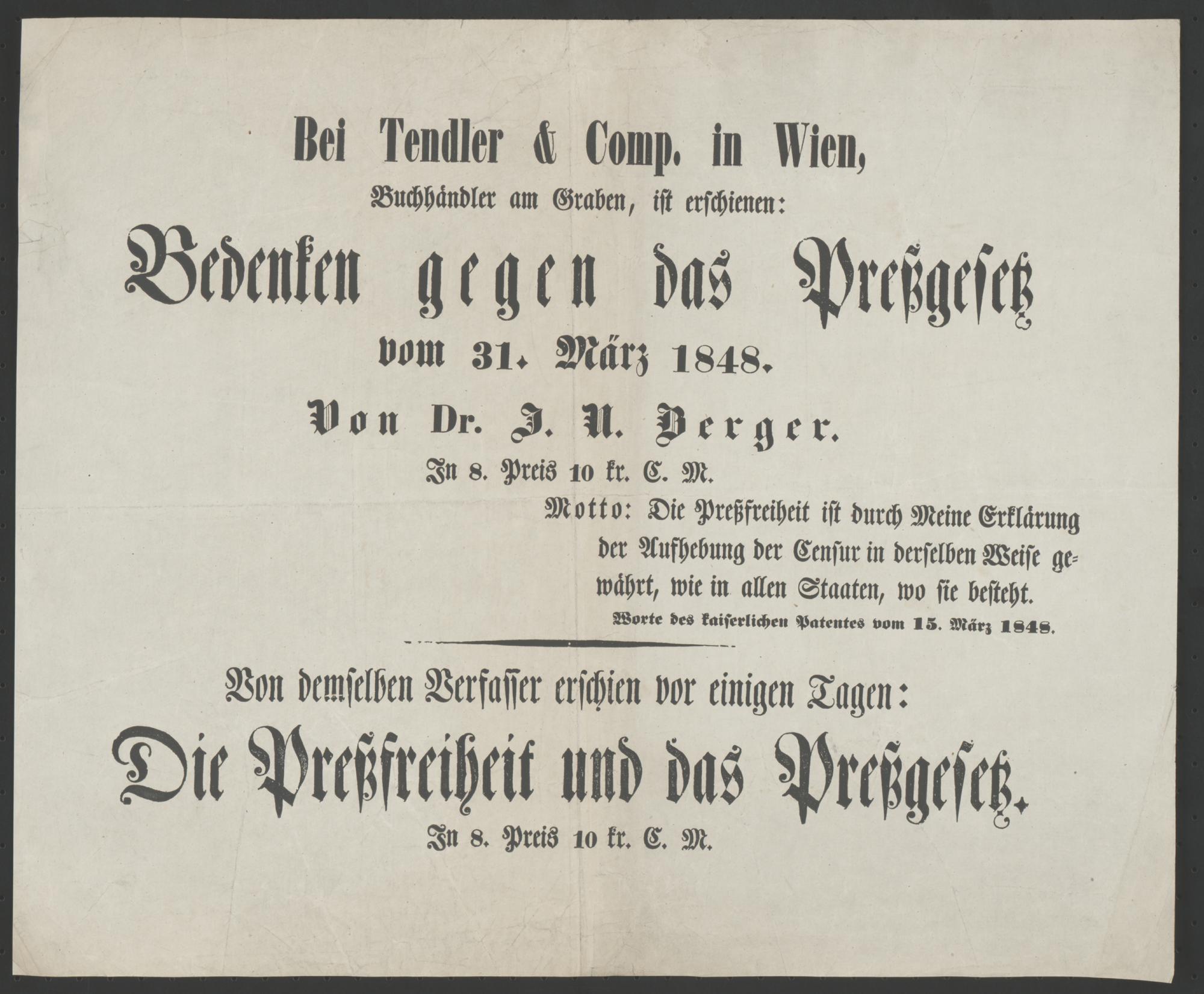 Bei Tendler & Comp. in Wien, Buchhändler am Graben, ist erschienen: Bedenken gegen das Preßgesetz vom 31. März 1848. Von Dr. J. N. Berger. In 8. Preis 10 kr. C. M. ...
