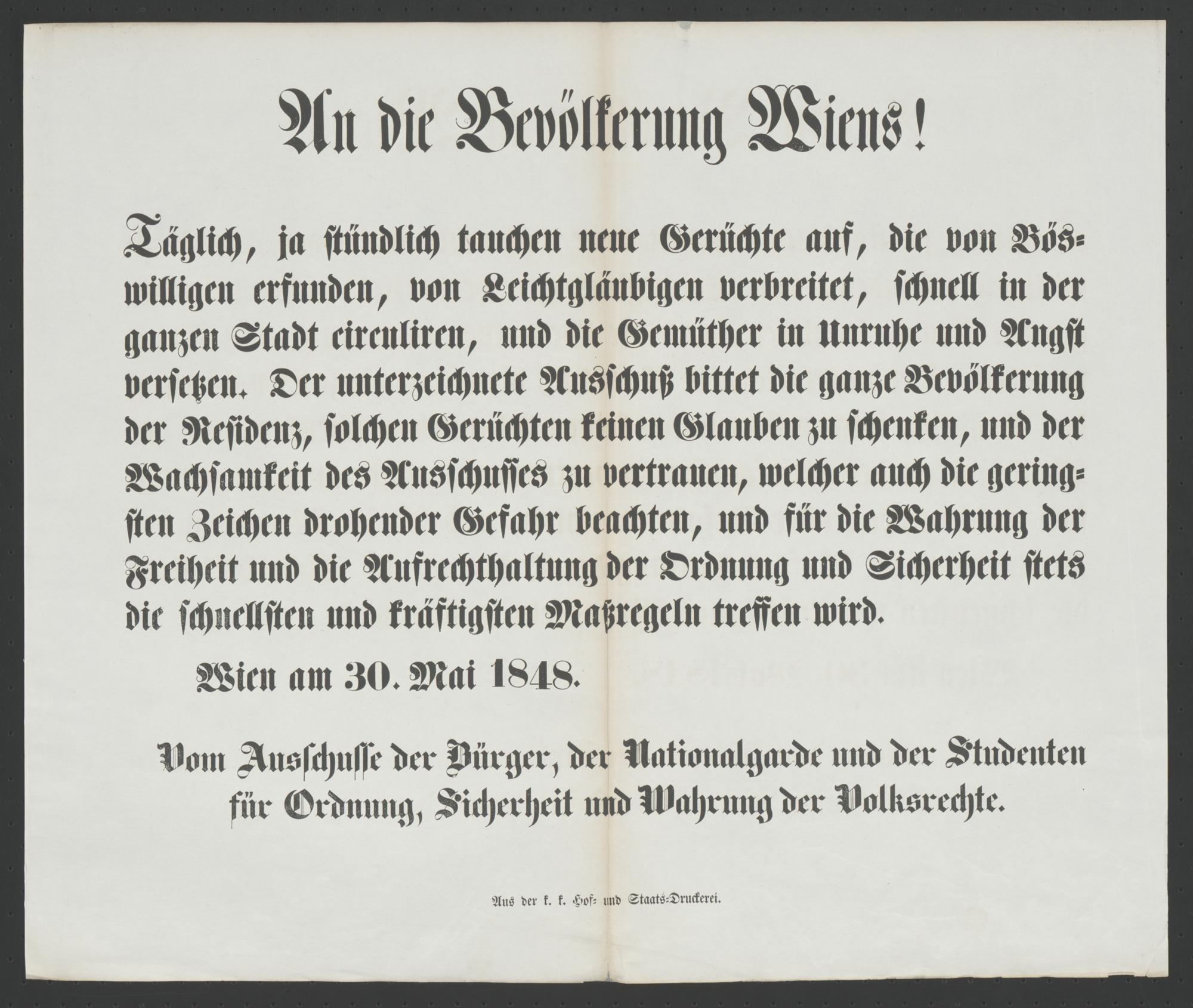 An die Bevölkerung Wiens! [Wien, 30. Mai 1848] : Täglich, ja stündlich tauchen neue Gerüchte auf, die von Böswilligen erfunden ... schnell in der ganzen Stadt circulieren ... ; Wien am 30. Mai 1848 / Vom Ausschusse der Bürger, der Nationalgarde und der Studenten, für Ordnung, Sicherheit und Wahrung der Volksrechte