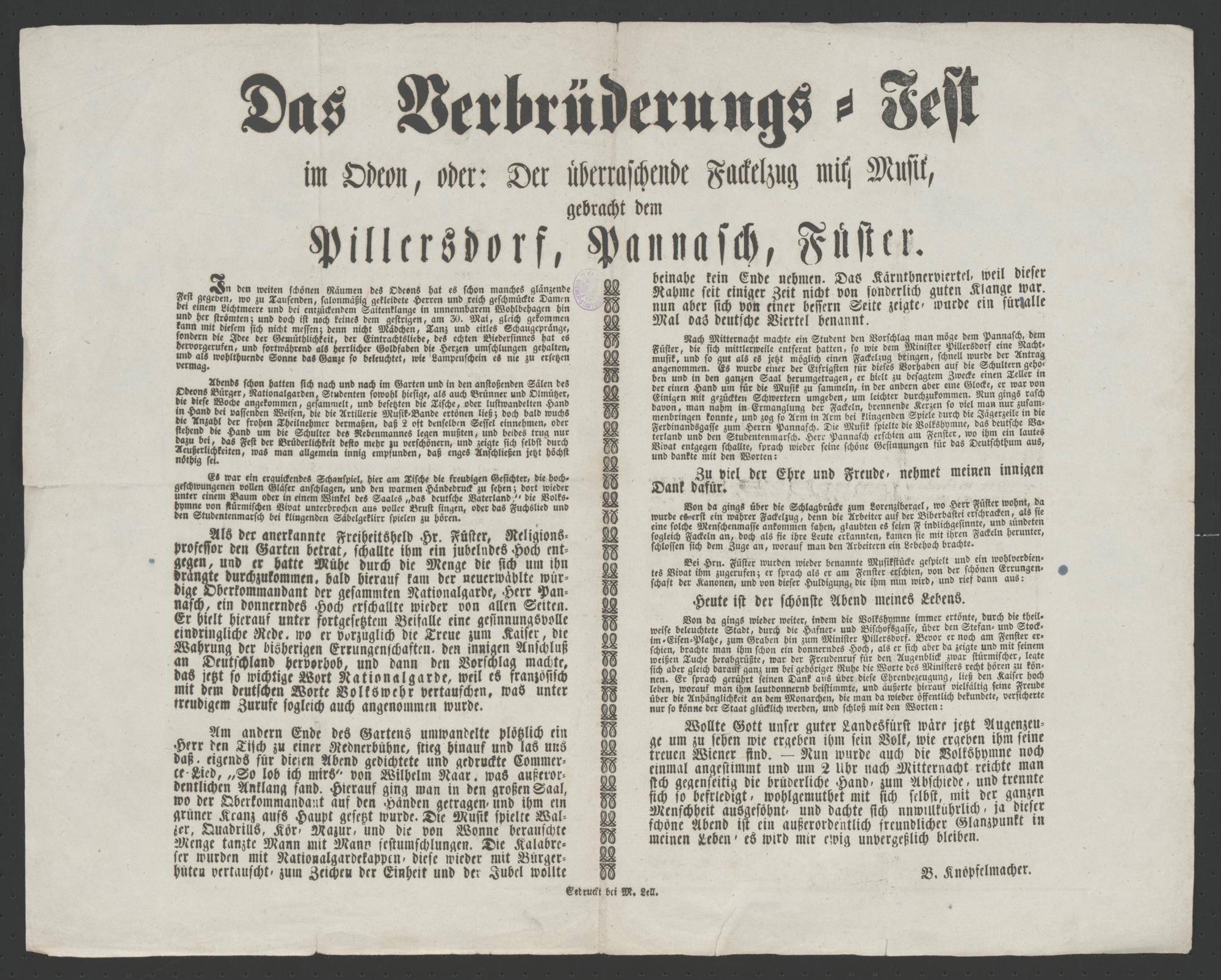 Das Verbrüderungs-Fest im Odeon, oder: Der überraschende Fackelzug mit Musik, gebracht dem Pillersdorf, Pannasch, Füster / B. Knöpfelmacher